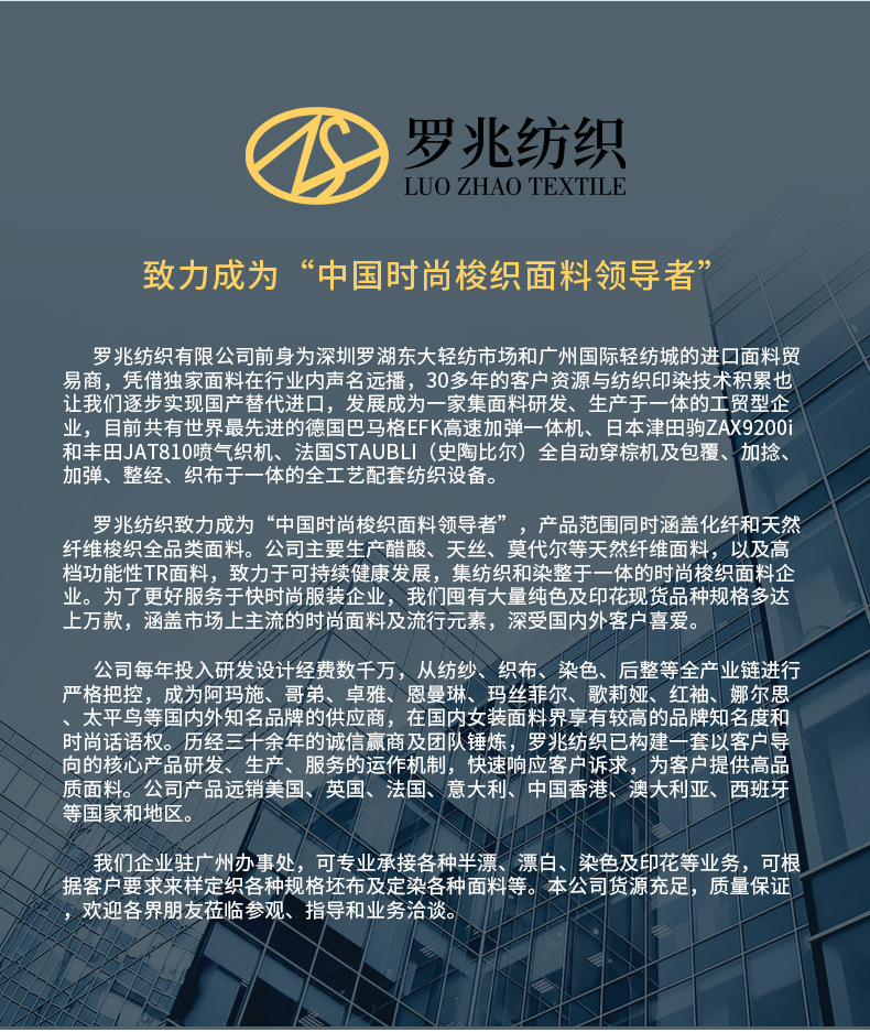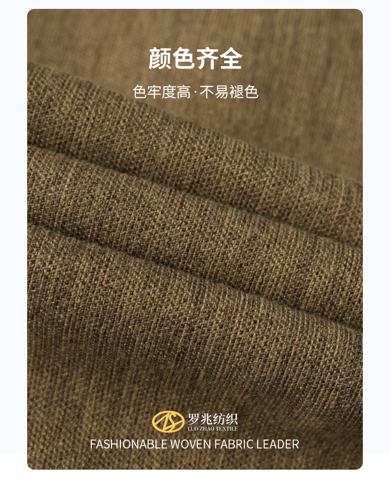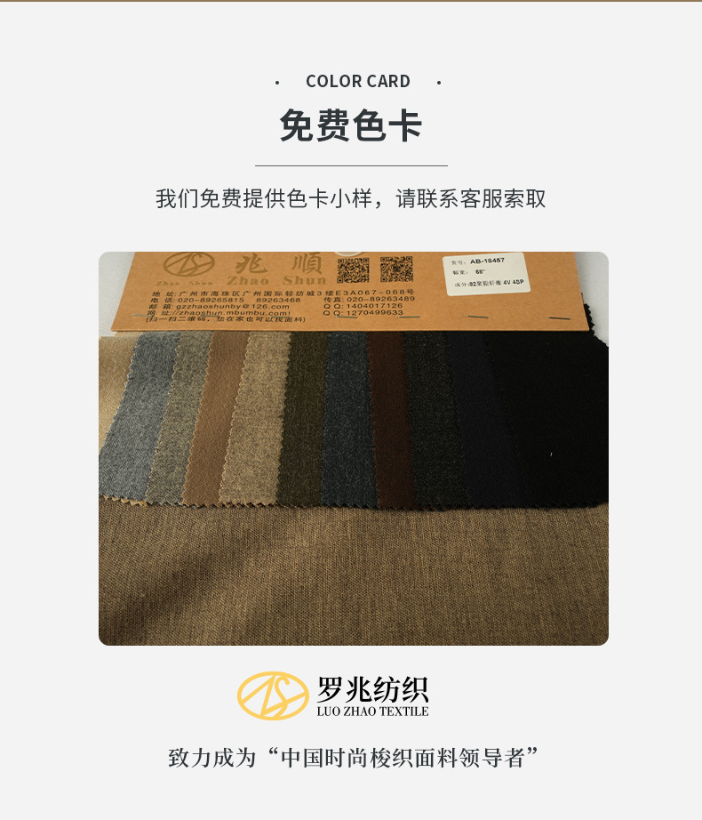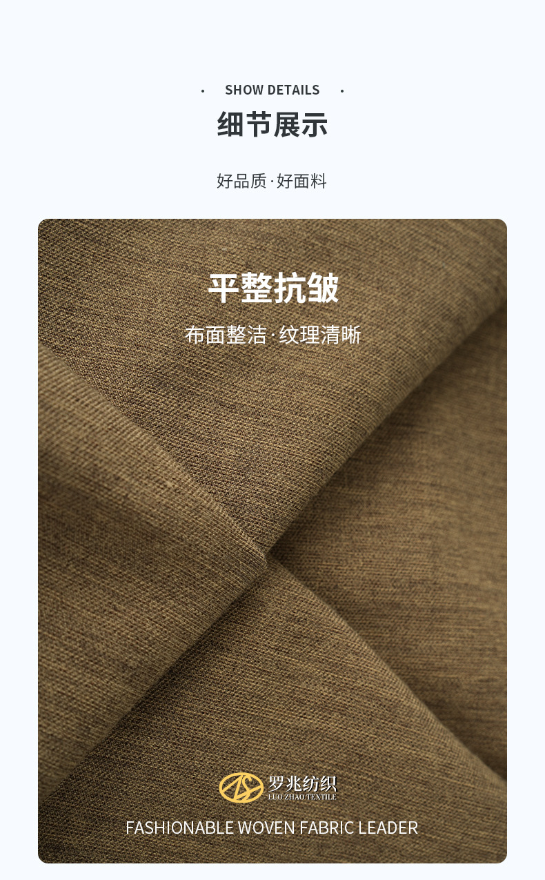 機能的特徴 TR起毛混紡生地スタイル、柔らかな肌触りとドレープ性、柔らかな肌触りとハリ感があり、生地を柔軟でスタイリッシュにしながらもファッション性に富んでいます。