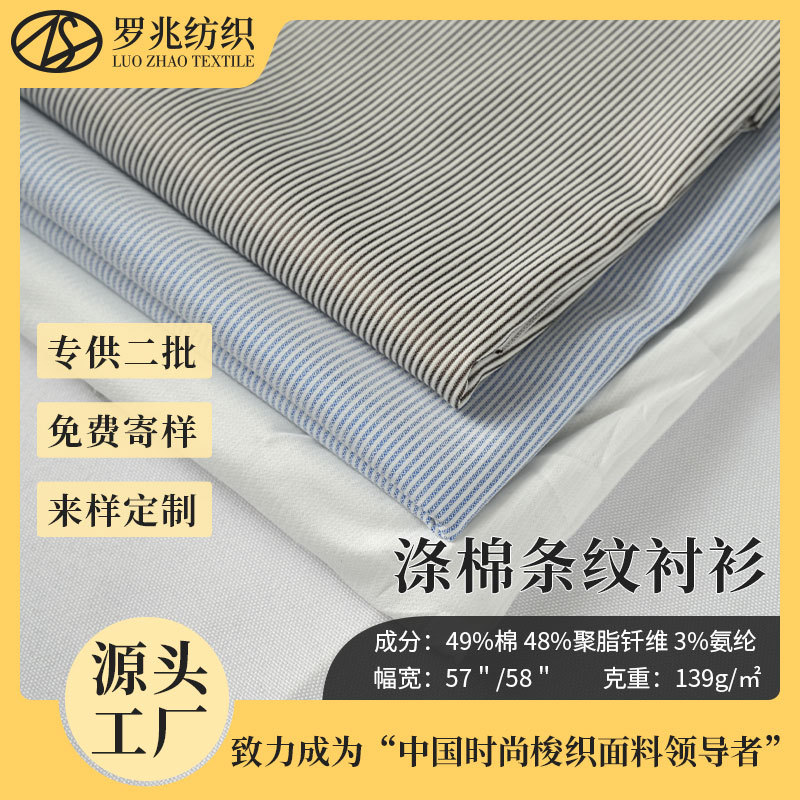 春夏無地織りビッチTC生地、コーマ糸パンツ・シャツ、ポリエステル綿混紡ストライプシャツ、オフィスウェア生地、在庫あり