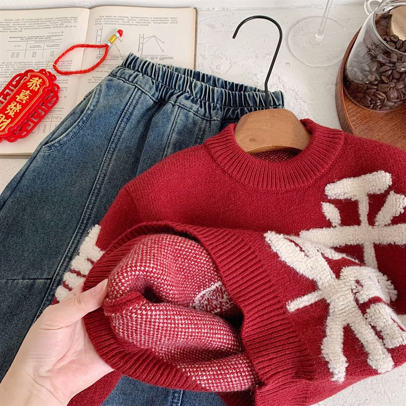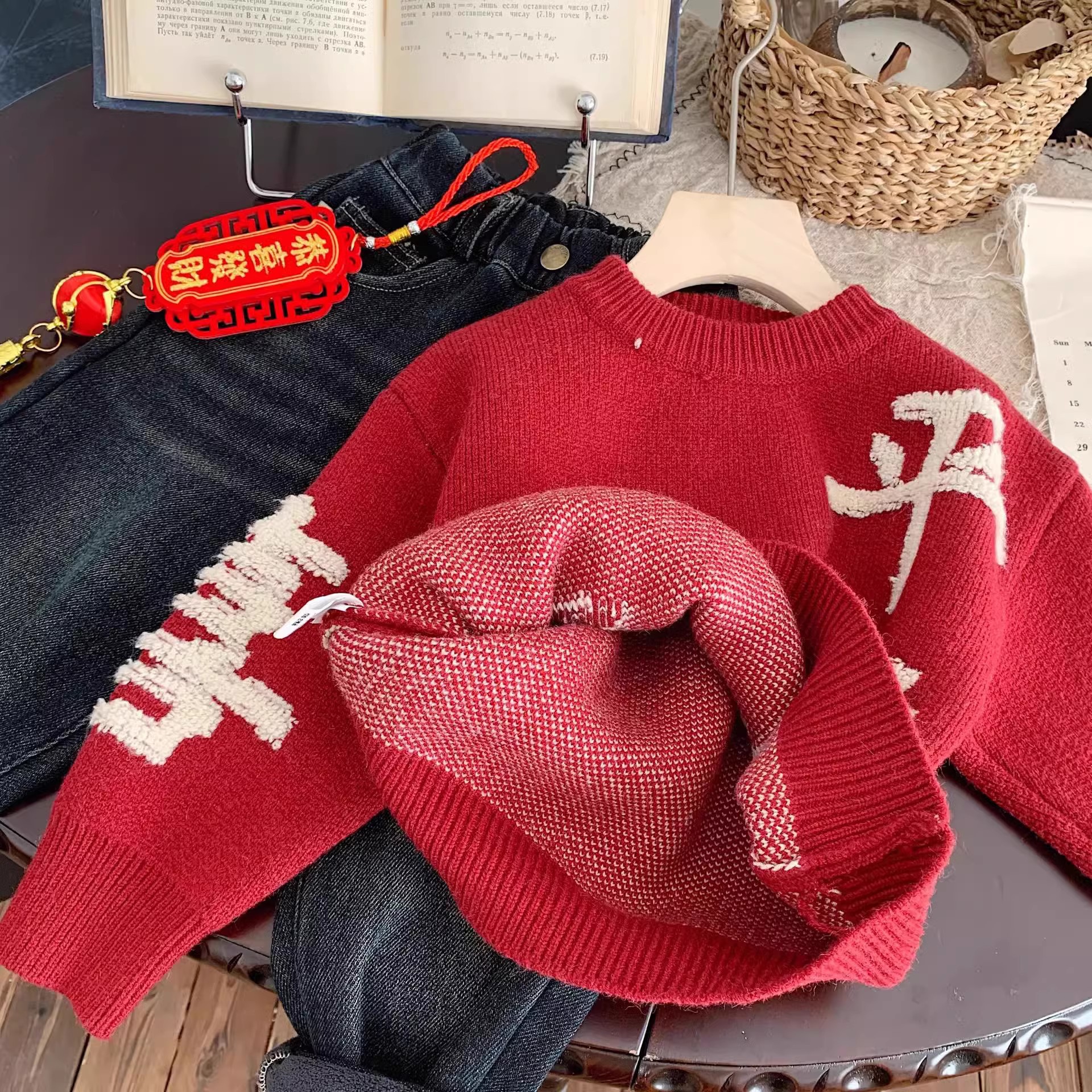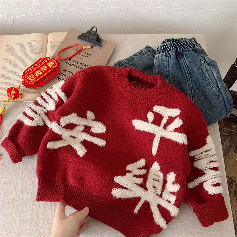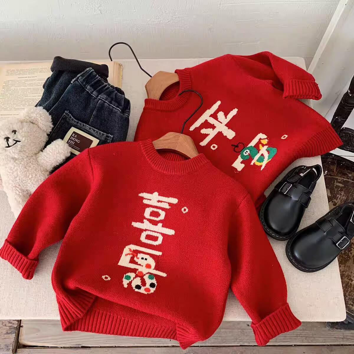 童星源子供用セーター2025冬新年お祝い服男の子女の子暖かいニットセータートップスインナー
