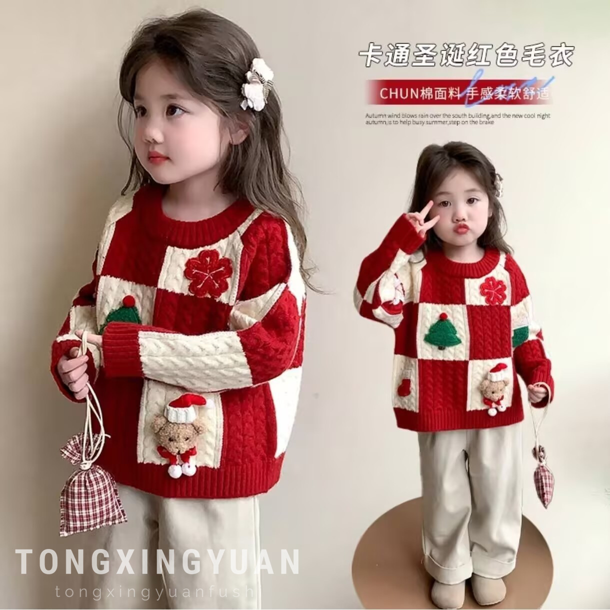 圣诞节毛衣儿童红色格子毛衣新年拜年服秋冬针织衫冬季保暖打底衣