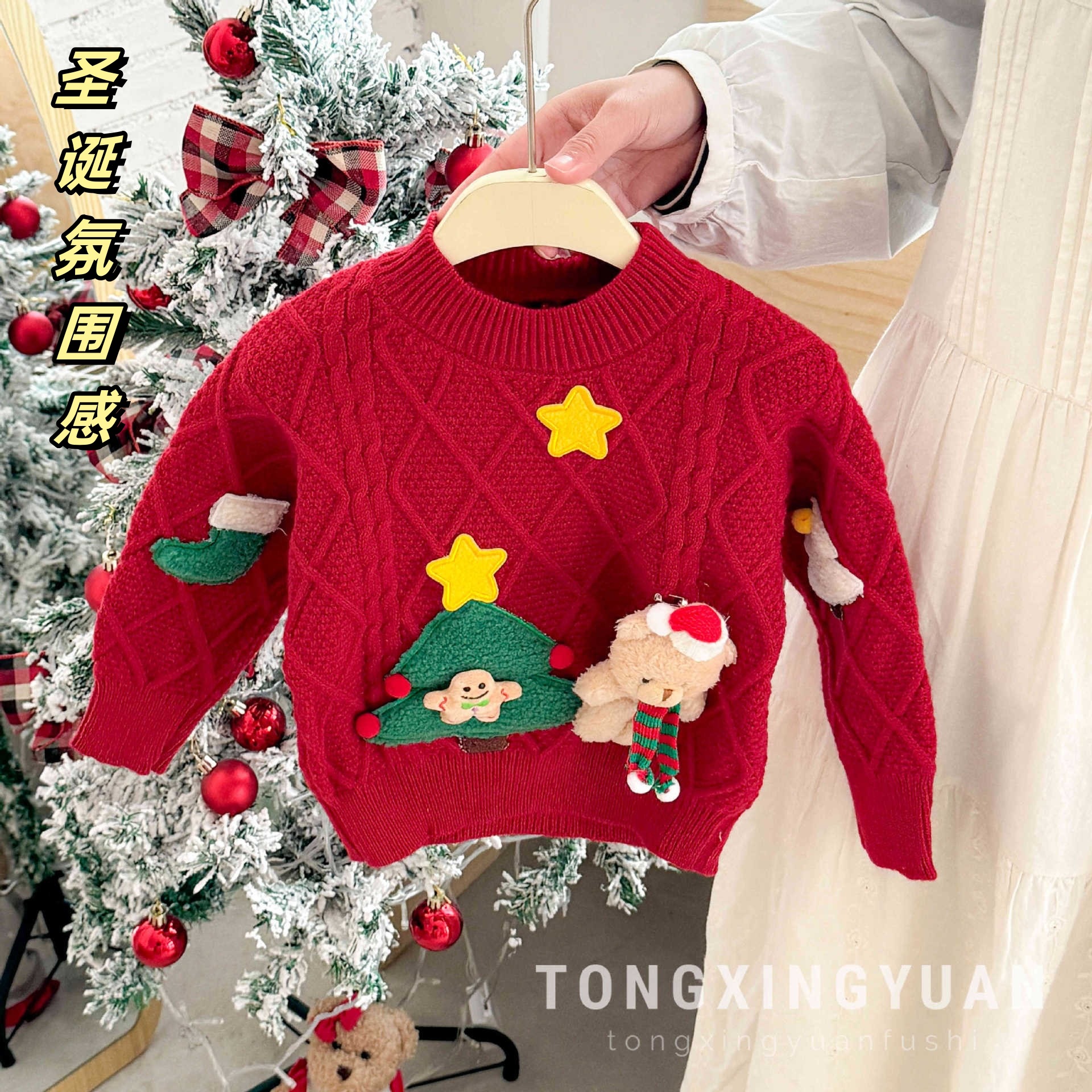 圣诞节氛围感~女童韩版秋冬新款毛衣秋冬装红色条纹小熊上衣跨境