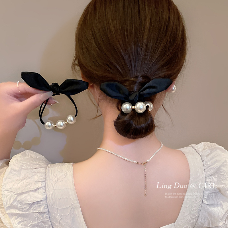 2024年真珠の蝶結びの髪輪の高弾力のポニーテールのゴムの丈夫な髪のウサギの耳のひもの頭飾り