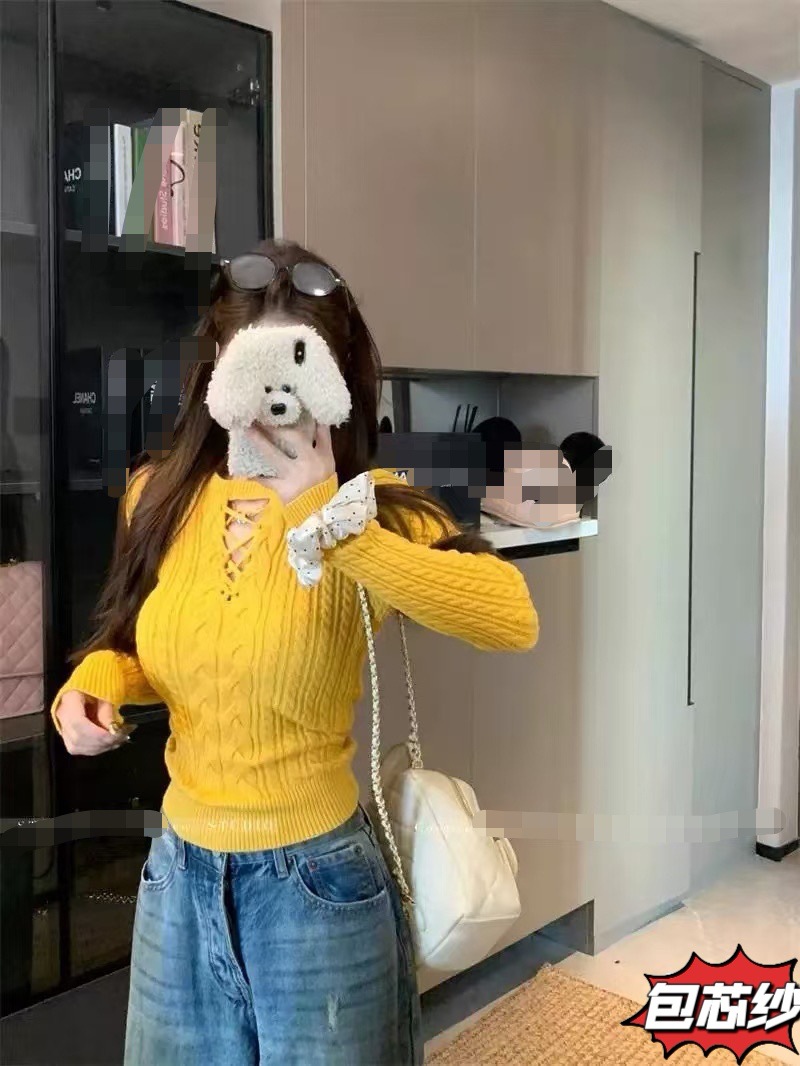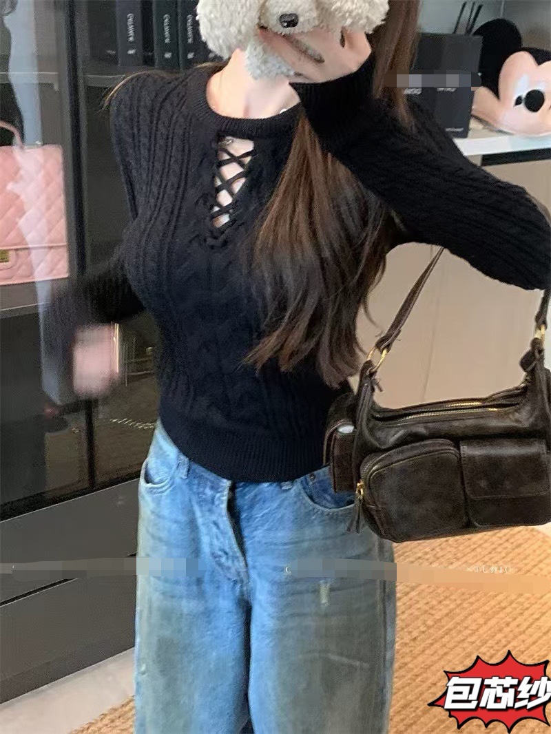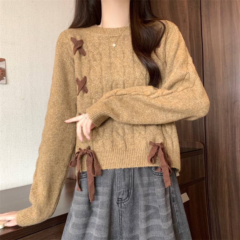 小个子短款绑带圆领毛衣女秋冬新款内搭慵懒风麻花套头针织打底衫