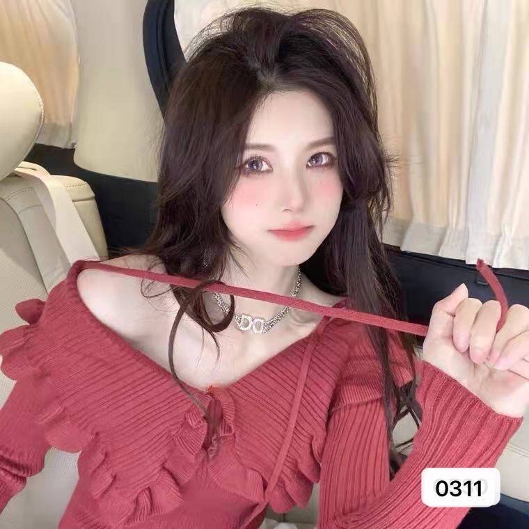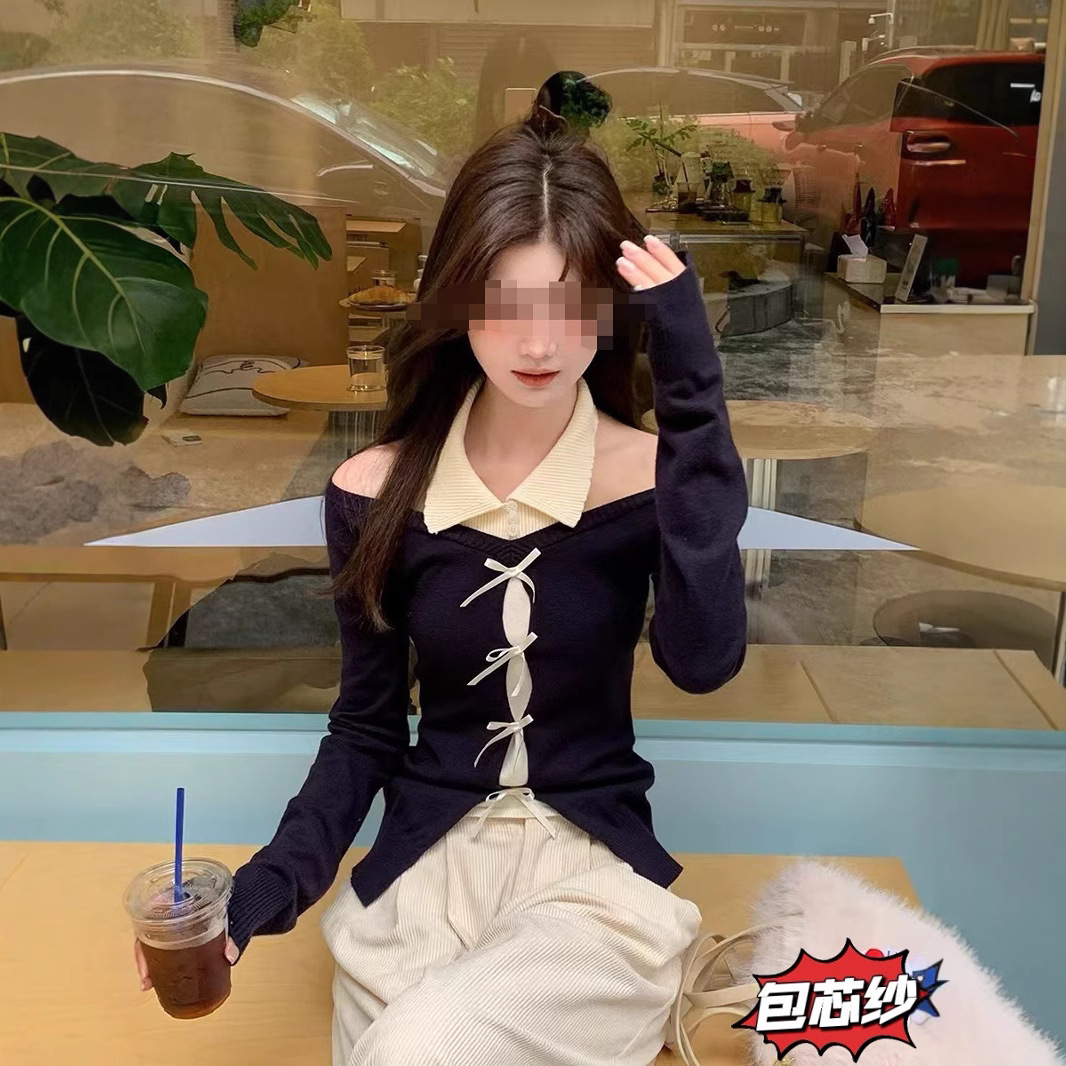 純粋な欲望のギャルの不規則な襟のtシャツの女性の秋の2024の新型の偽の2枚の修身は腰のニットの上着を収めます。