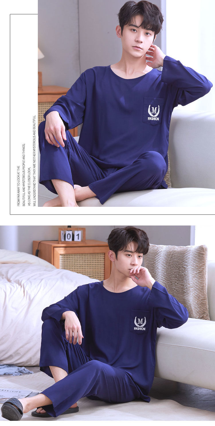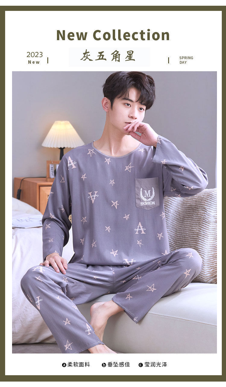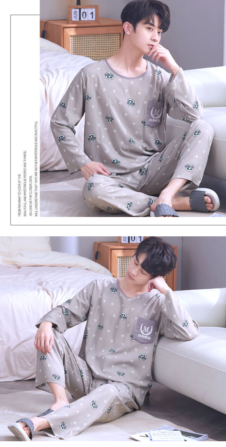 新商品の男性パジャマ綿の長袖ズボンセットの薄いサイズの春と秋のカジュアルでゆったりした家庭服は外に着ることができます。