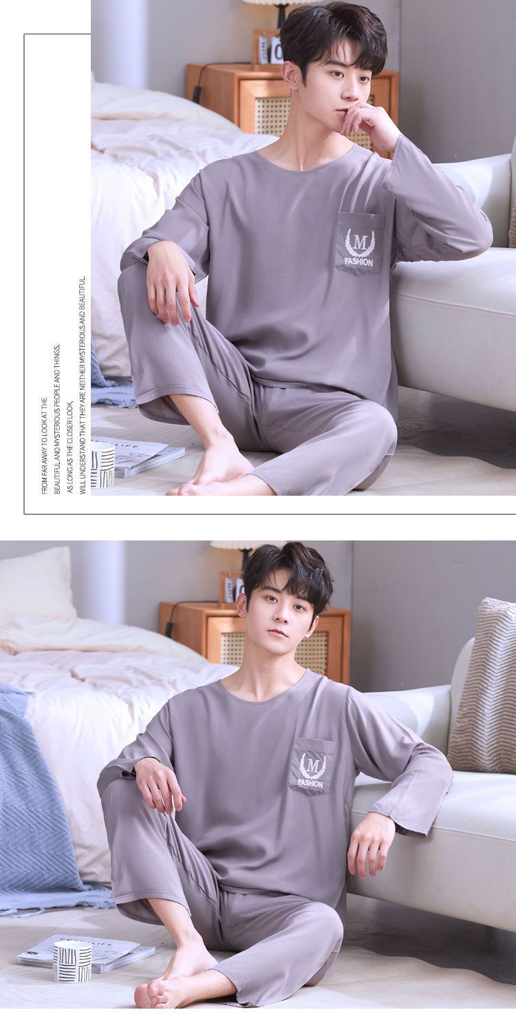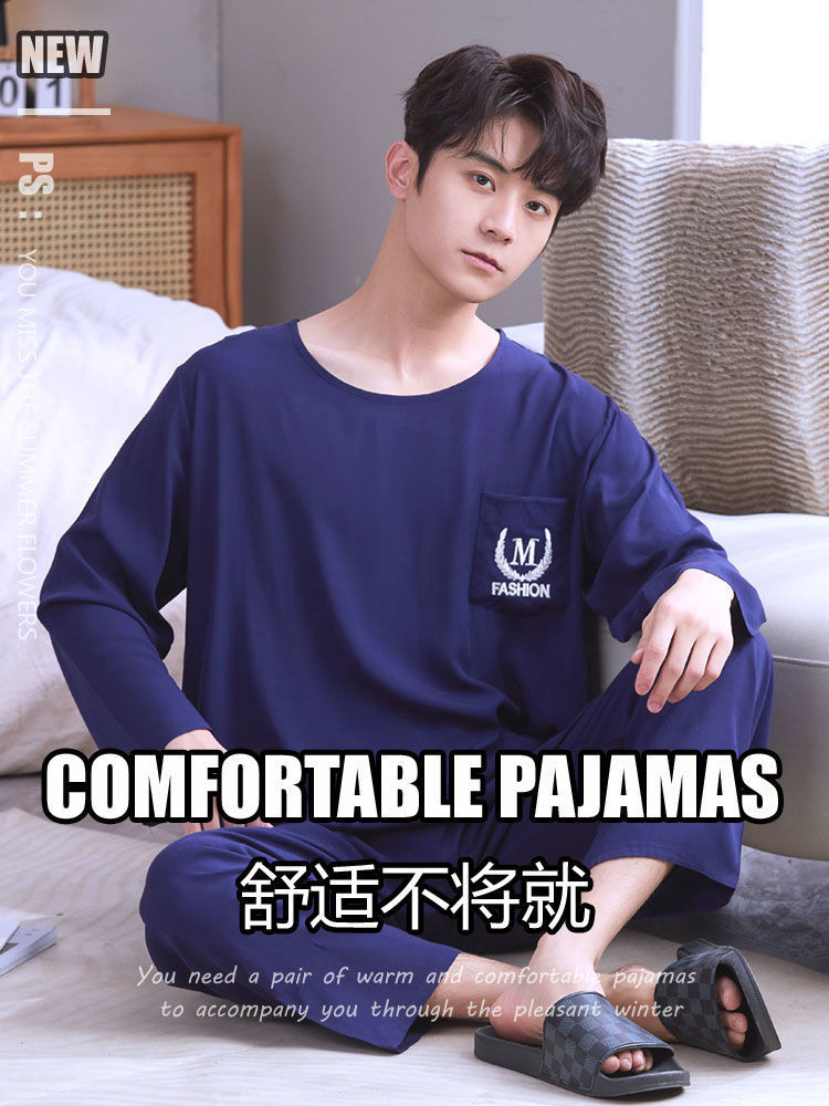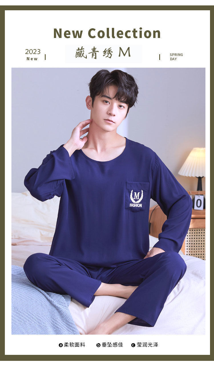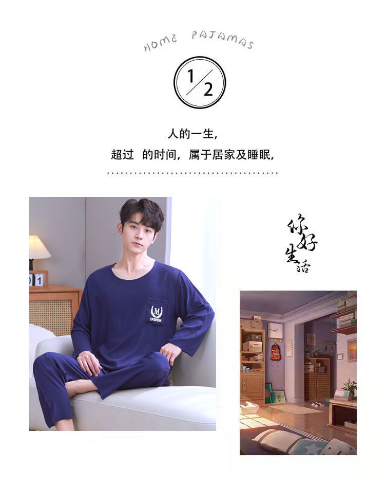 新商品の男性パジャマ綿の長袖ズボンセットの薄いサイズの春と秋のカジュアルでゆったりした家庭服は外に着ることができます。