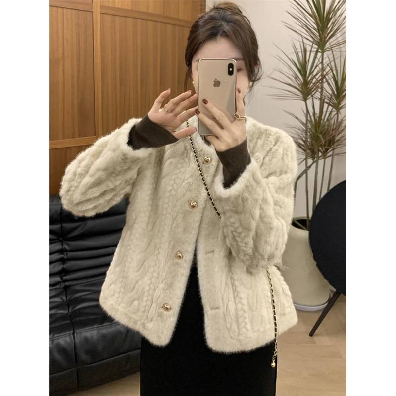 高级感皮毛一体仿水貂绒短外套女冬宽松百搭小香风加棉厚开衫上衣