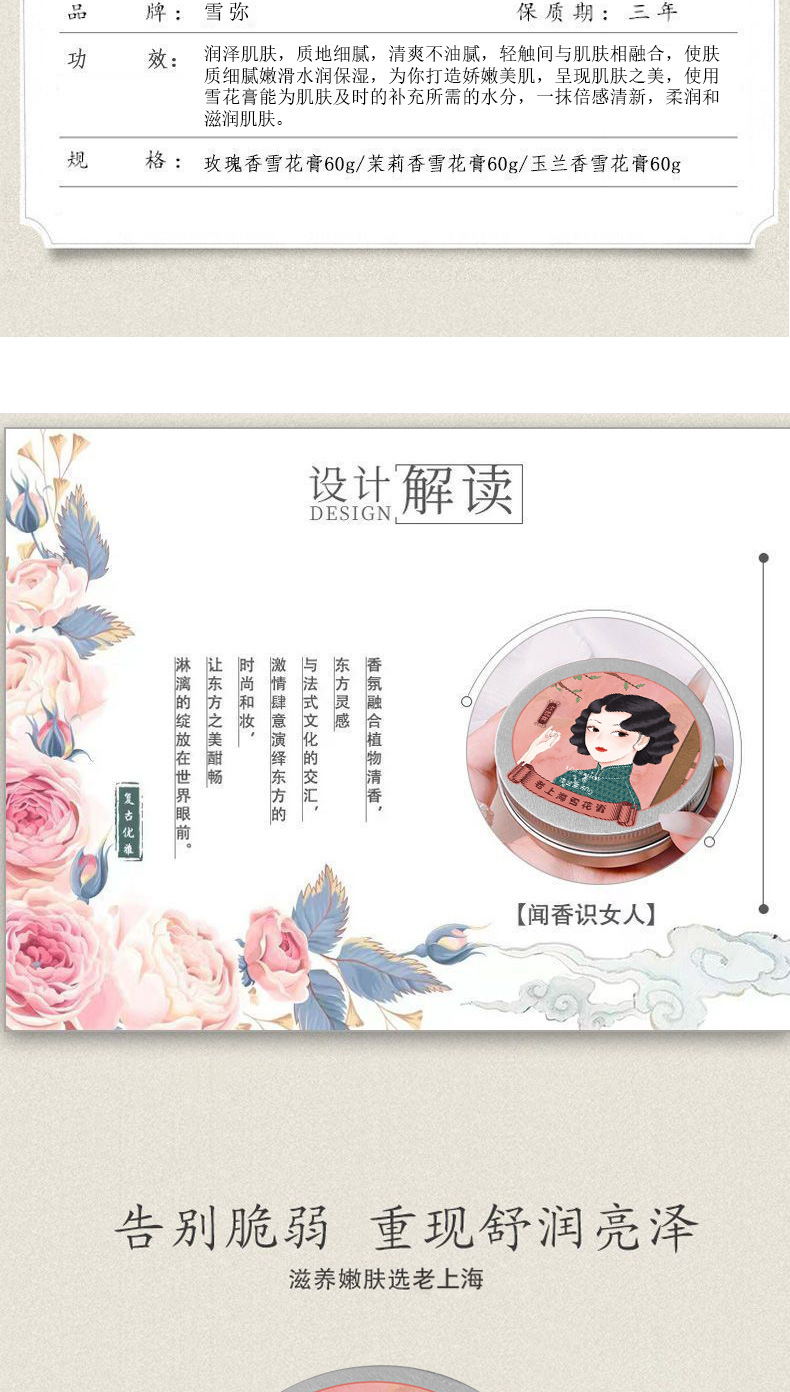 产品规格 雪弥老上海雪花膏【玫瑰香】,雪弥老上海雪花膏【茉莉香】,雪弥老上海雪花膏【玉兰香】
