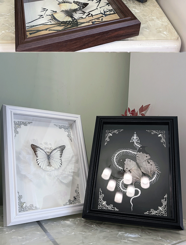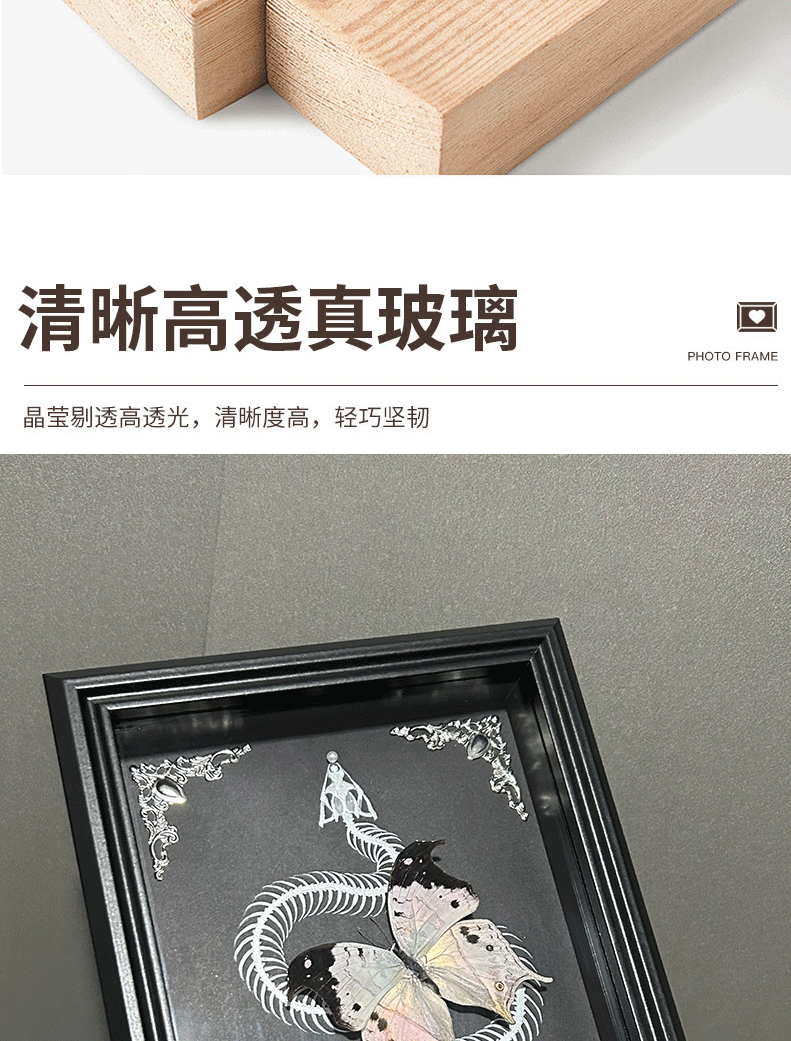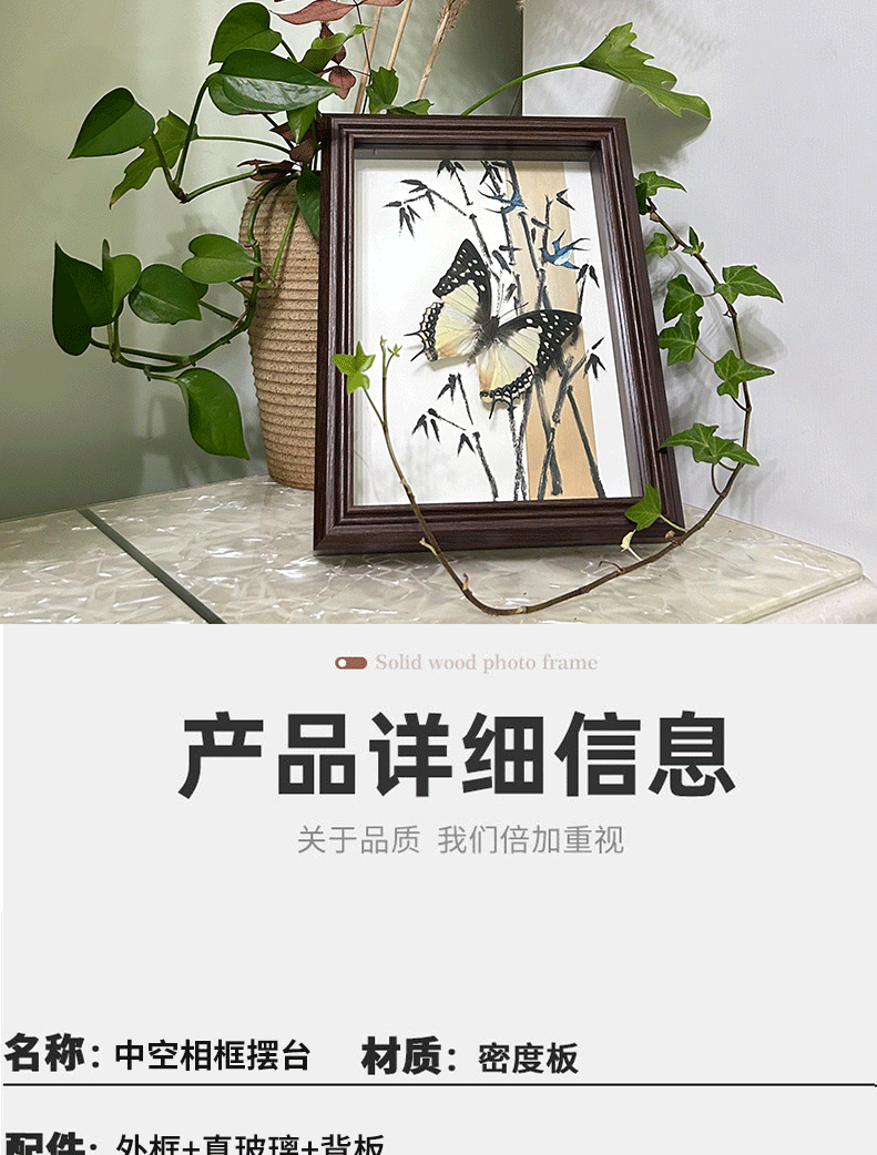 中空3cm真玻璃蝴蝶标本木质相框摆台昆虫干花贝壳粘土diy展示框