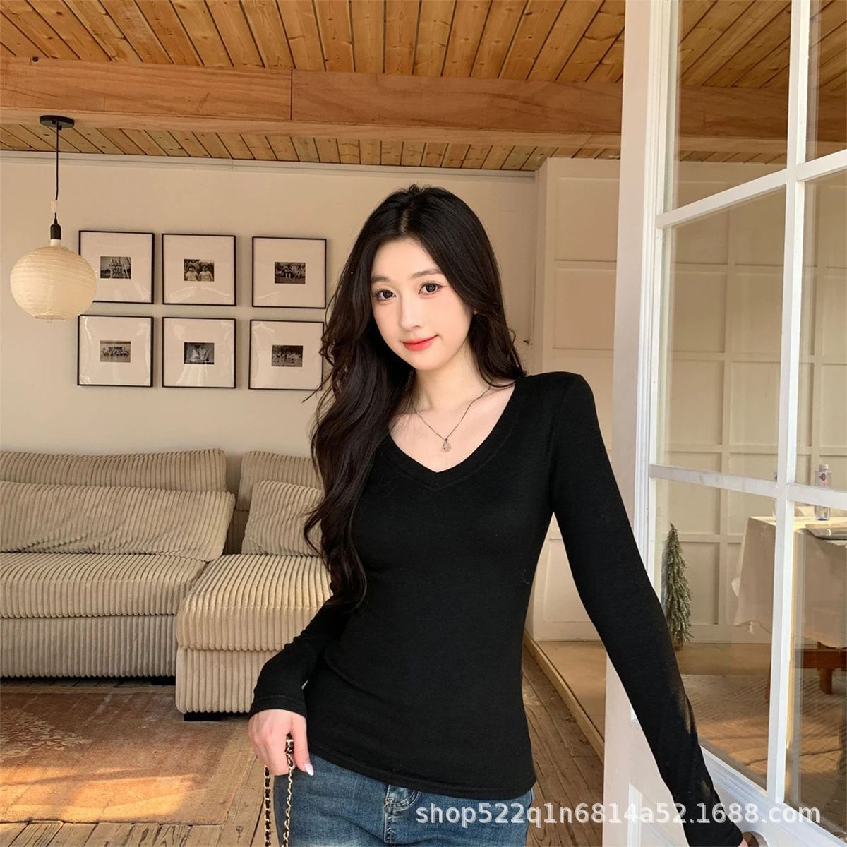 新商品の綿のカシミヤとベルベットの厚い底のシャツの女装の秋冬の正肩は身を修めてやせているvネックの中で長袖のtシャツを掛けます。