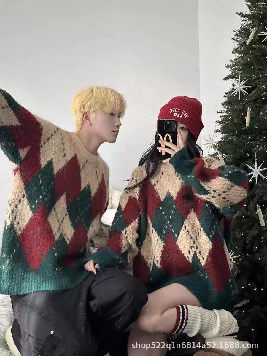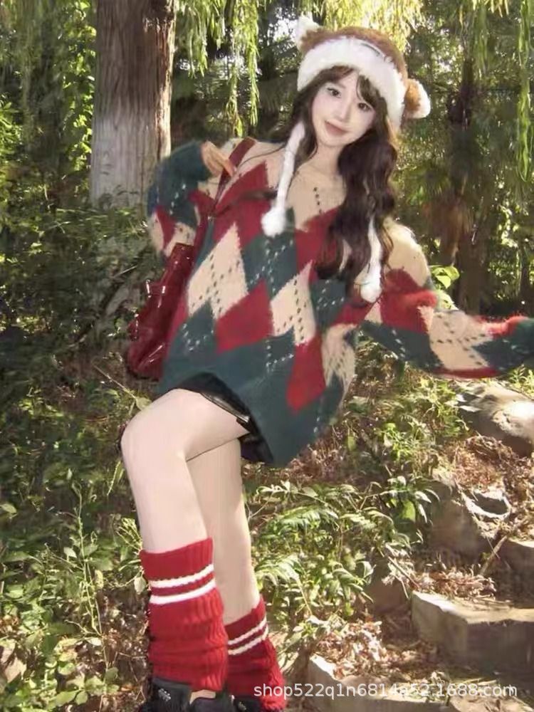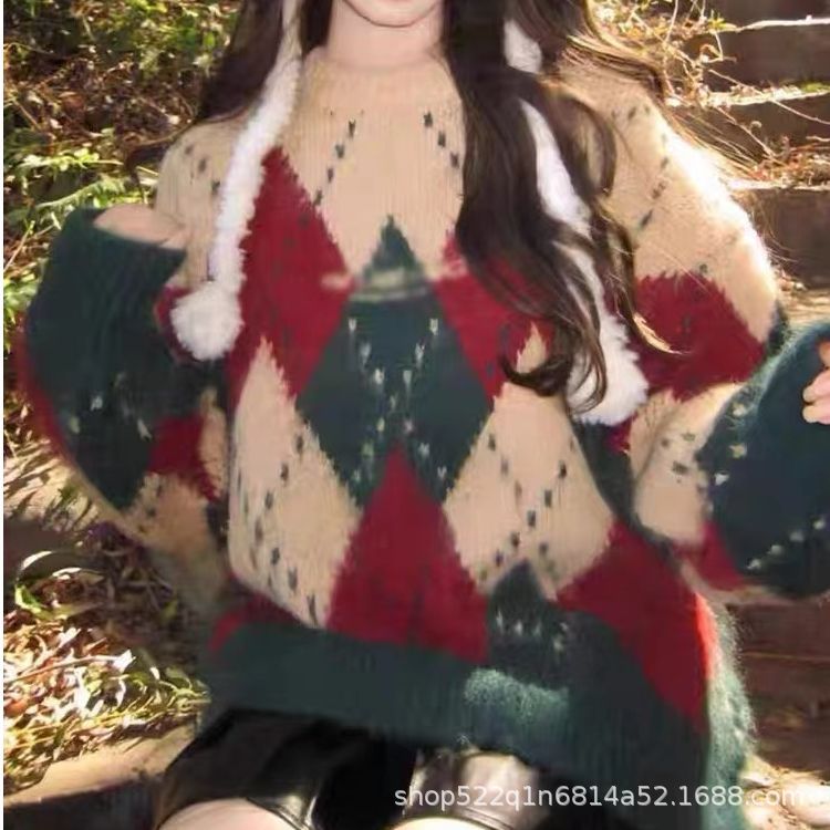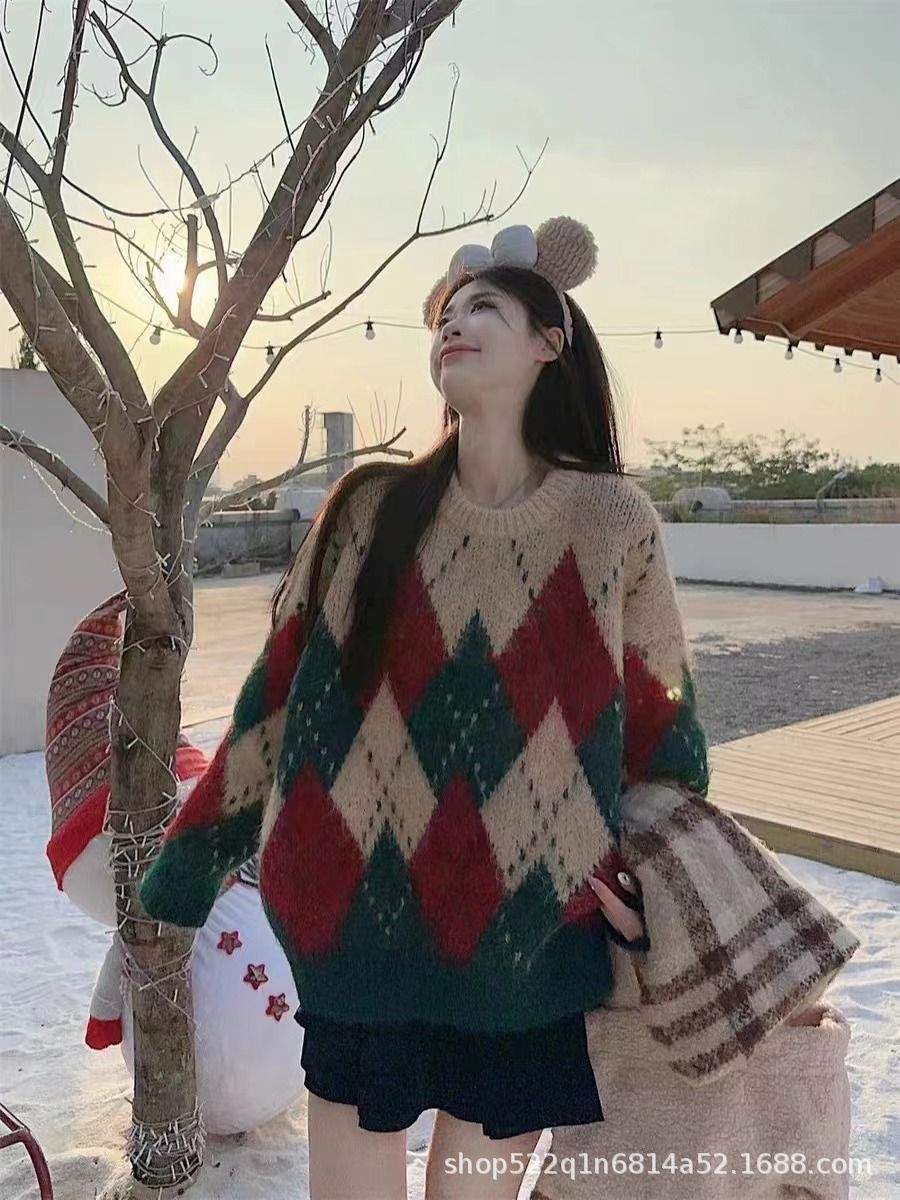 アメリカのレトロな菱格のクリスマスのセーターの女性の秋冬のゆったりしている怠惰な風のニットのデザイン感の厚い洋風の上着