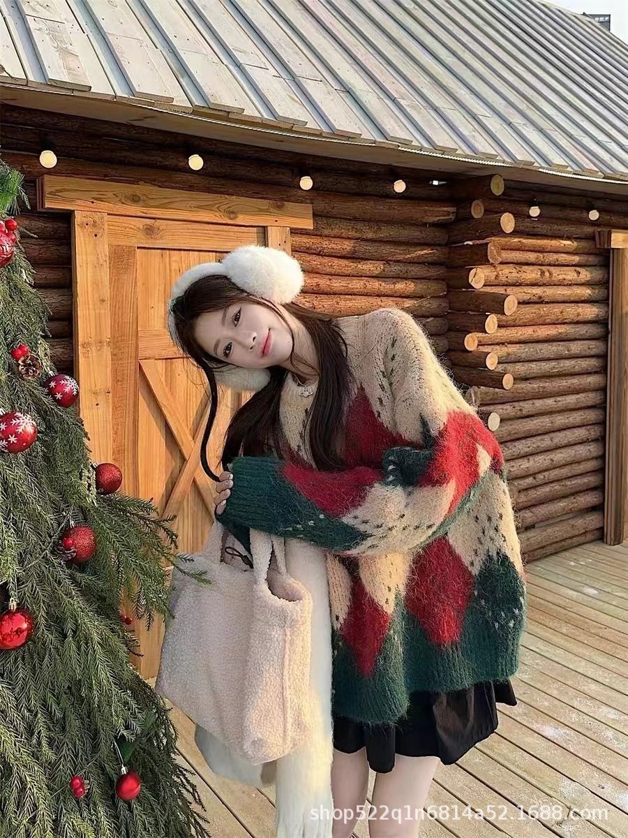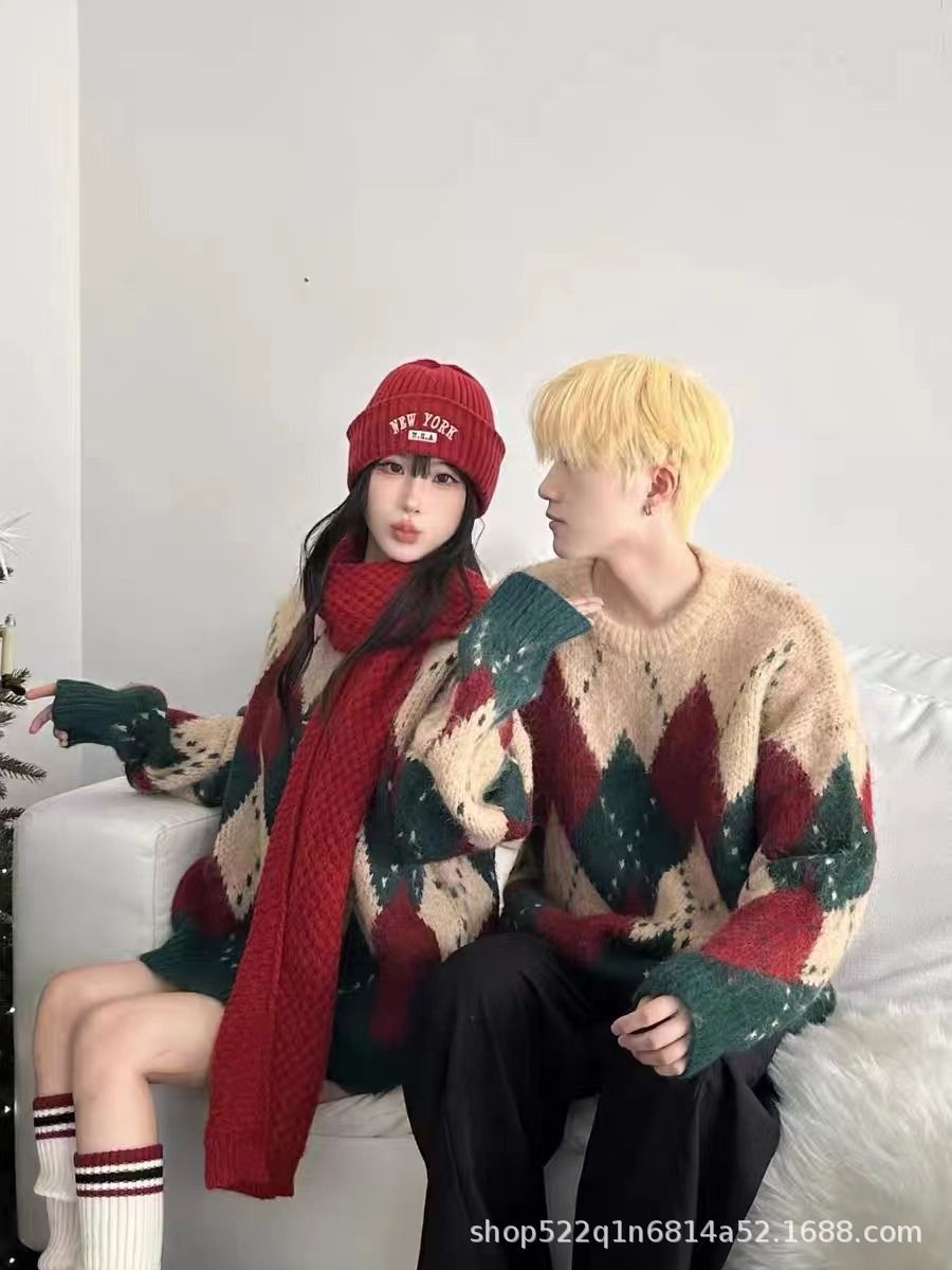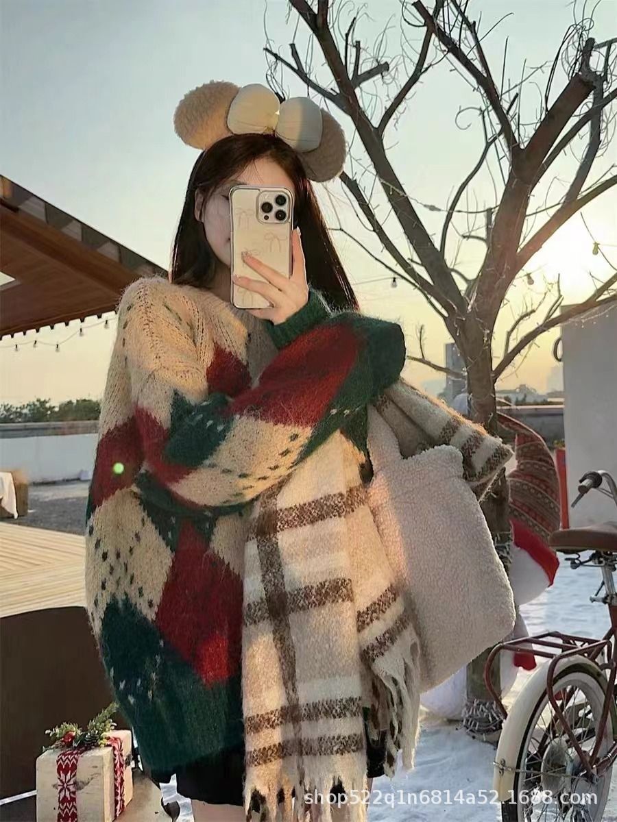 アメリカのレトロな菱格のクリスマスのセーターの女性の秋冬のゆったりしている怠惰な風のニットのデザイン感の厚い洋風の上着