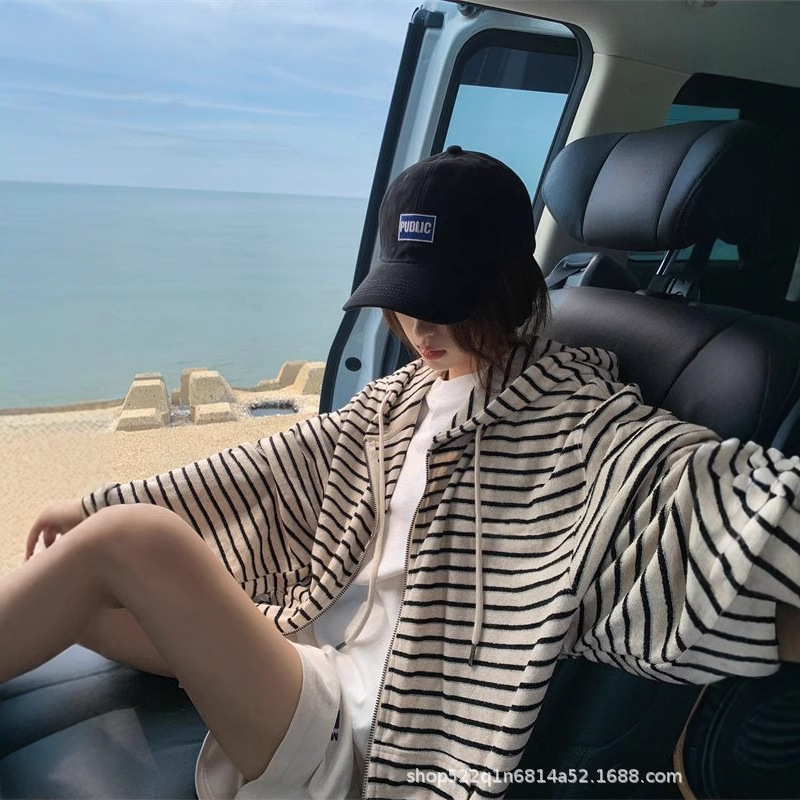 アメリカのストライプの帽子の怠惰な風のコートの女性の薄い金の小さい背の春と秋のゆったりした長袖のカーディガンの卸売り