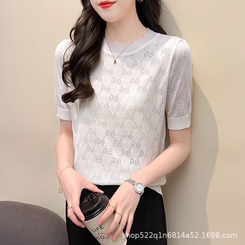 クロスボーダーの夏の薄い半袖tシャツの女性の丸首の透かし彫りの氷の糸のニットはゆったりとしていて、やせています。卸売り
