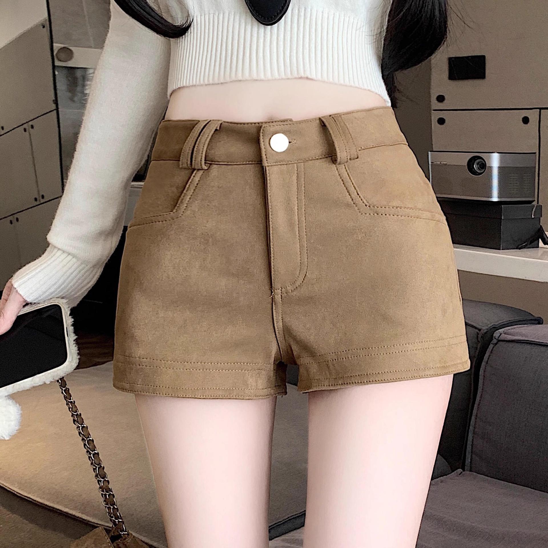 咖色鹿绒皮短裤女微胖mm秋冬辣妹美拉德高腰外穿a字热裤打底靴裤