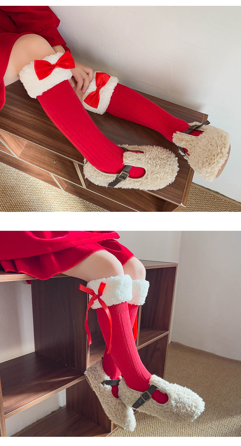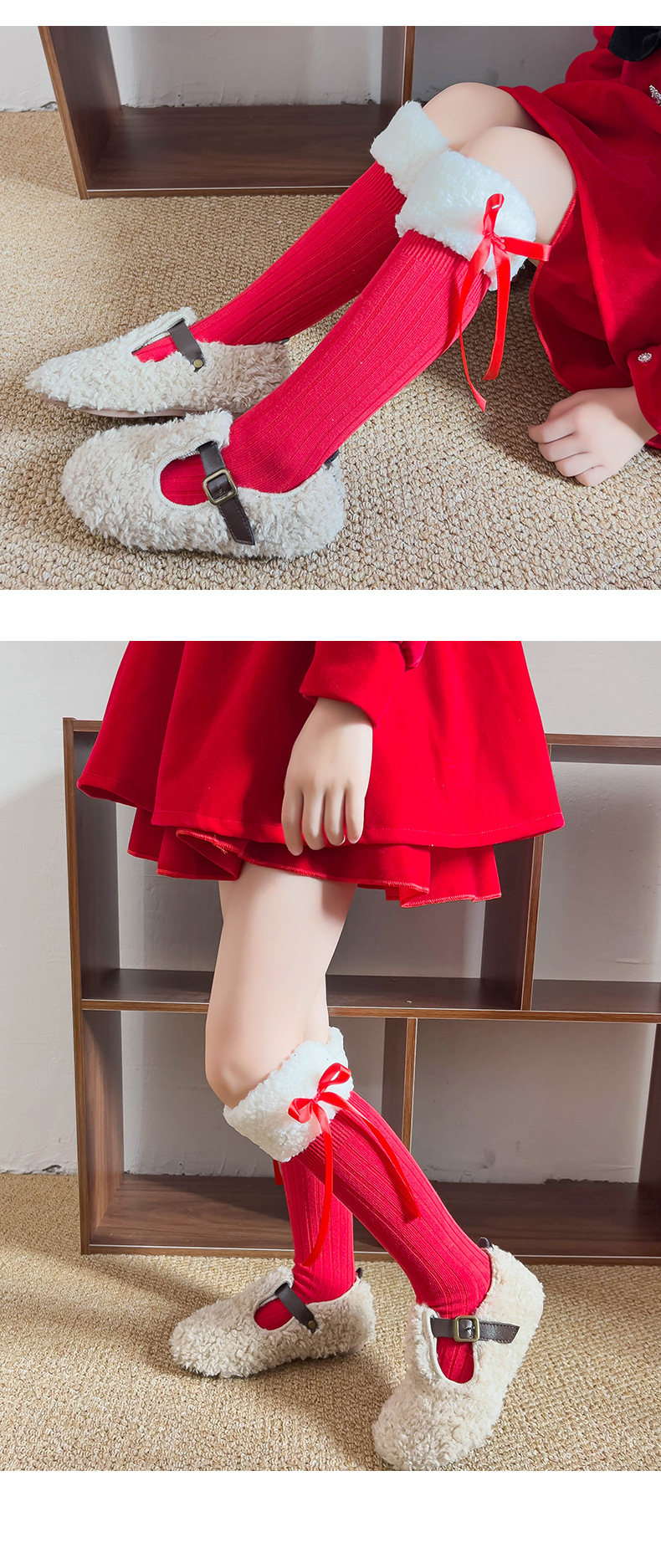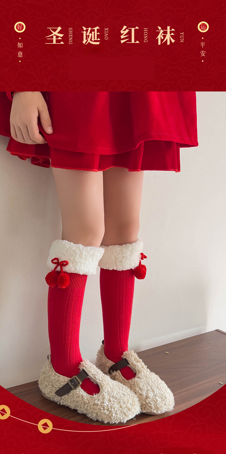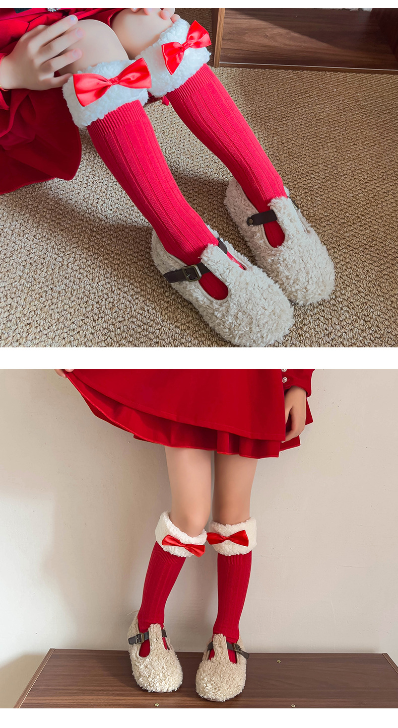【新品】新年袜子中筒秋冬季女童红色蝴蝶结中小童8岁3新年长筒袜