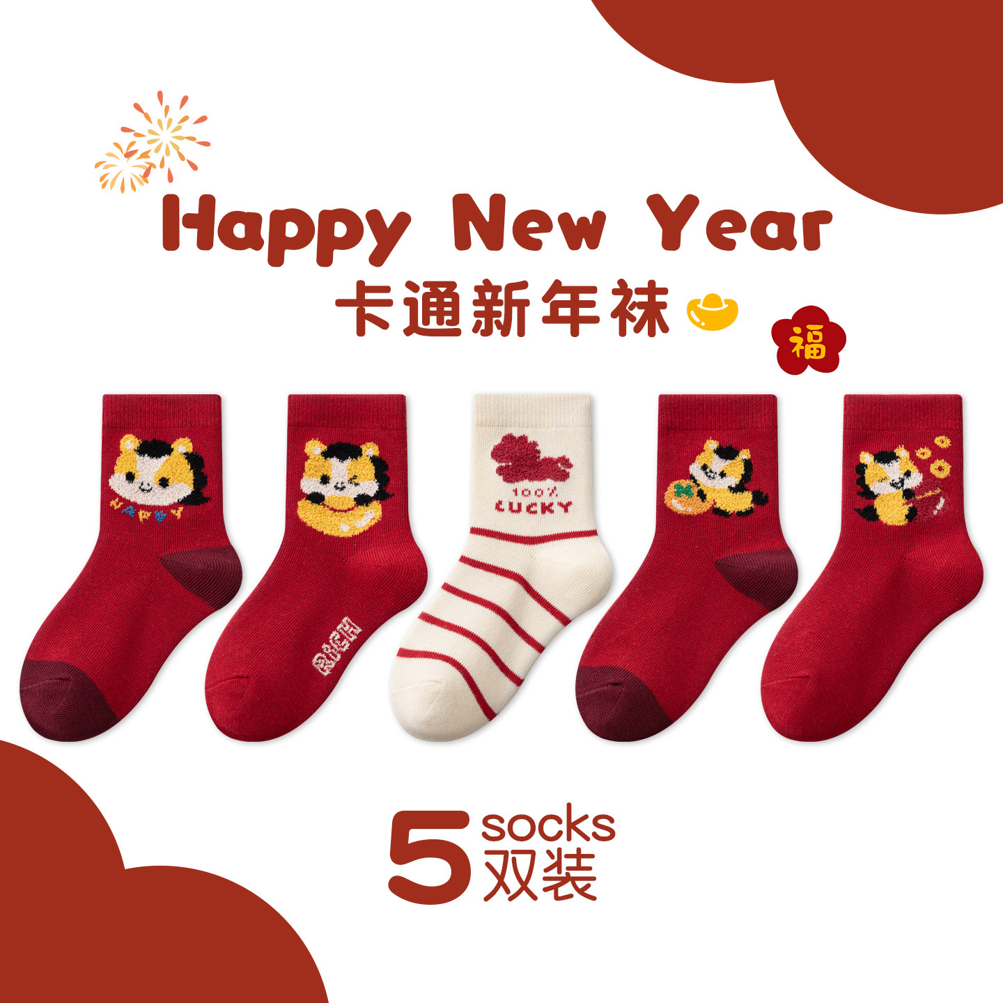 新年袜子男童袜马年本命年儿童中筒棉袜卡通可爱大红色袜子女童袜