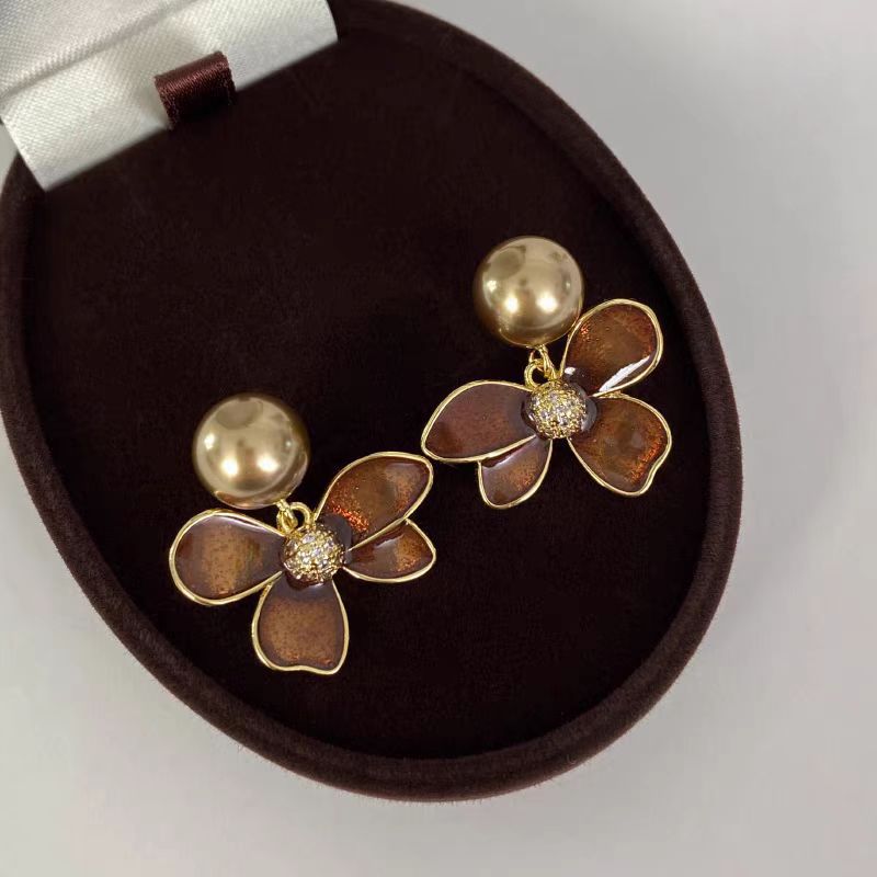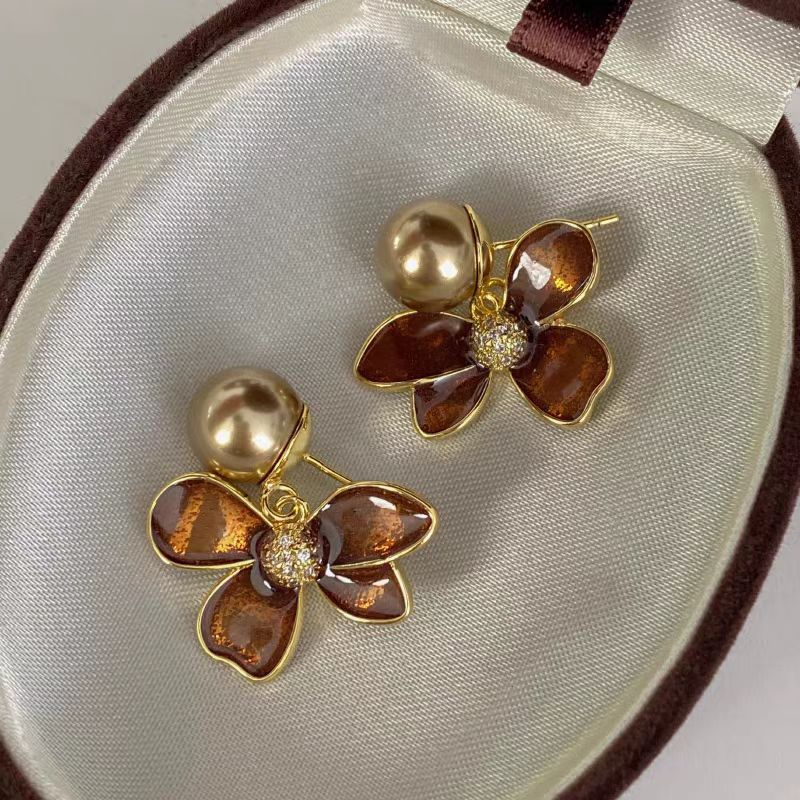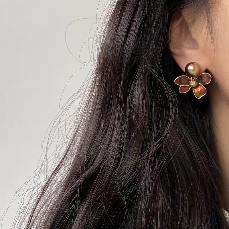 秋冬美拉德滴油咖色花朵耳钉时尚百搭高级感耳饰轻奢设计珍珠耳环