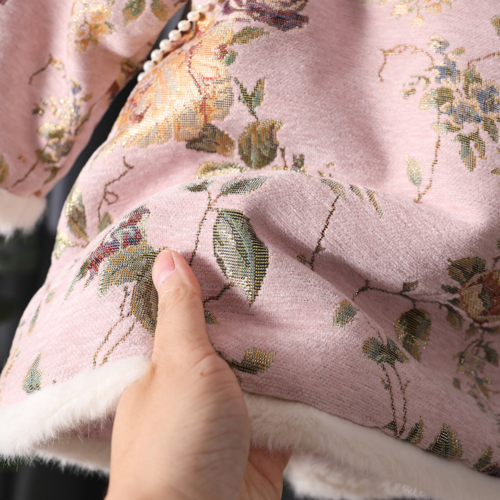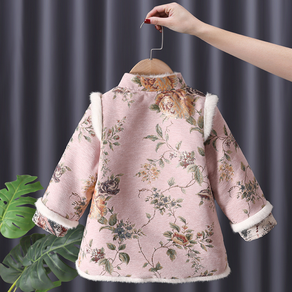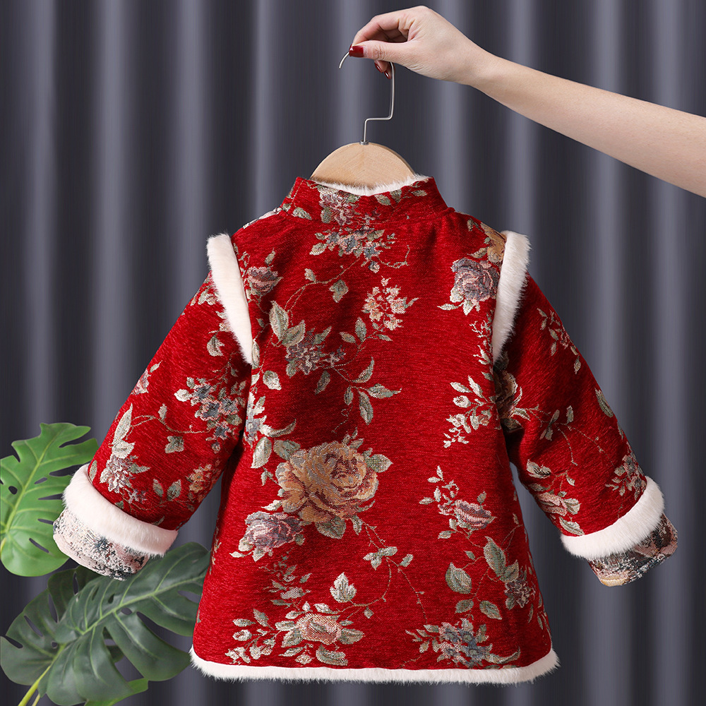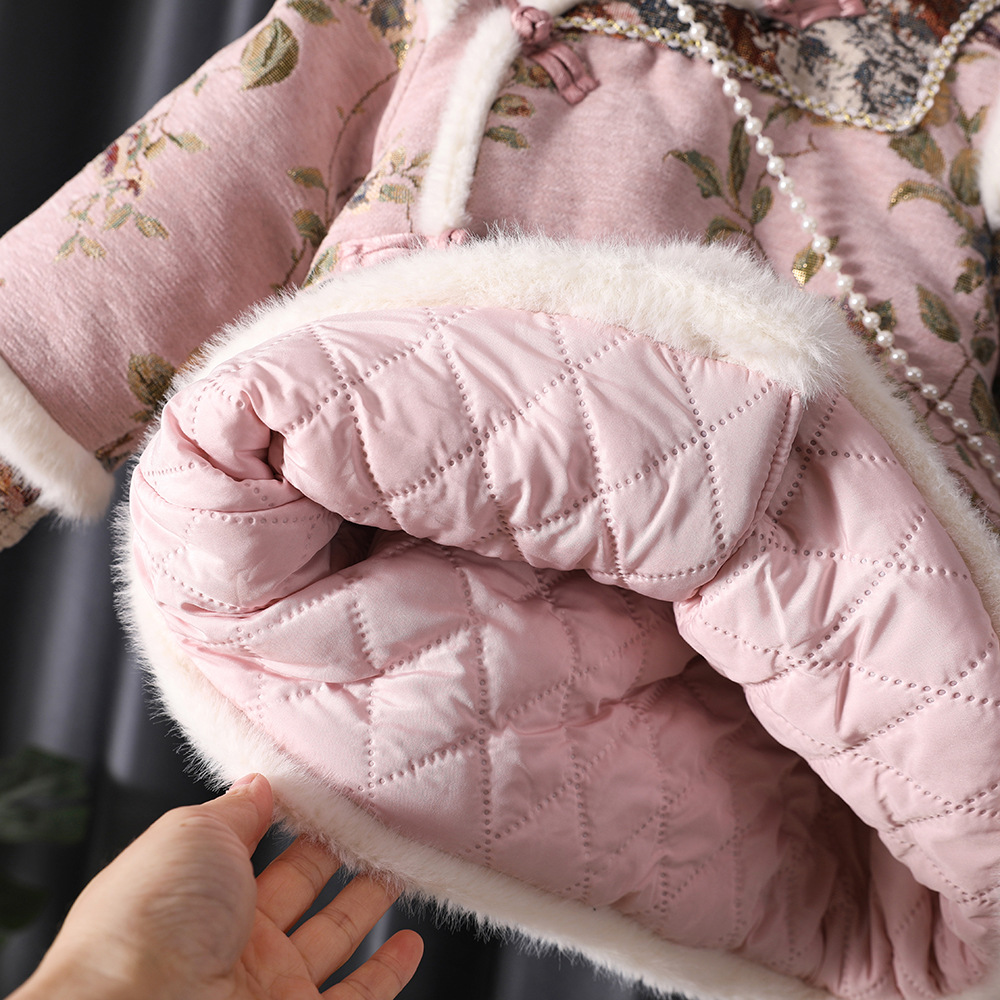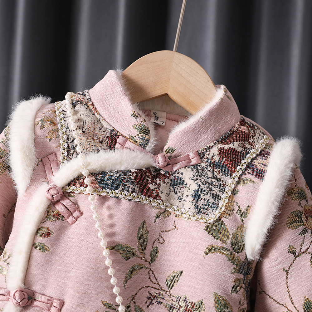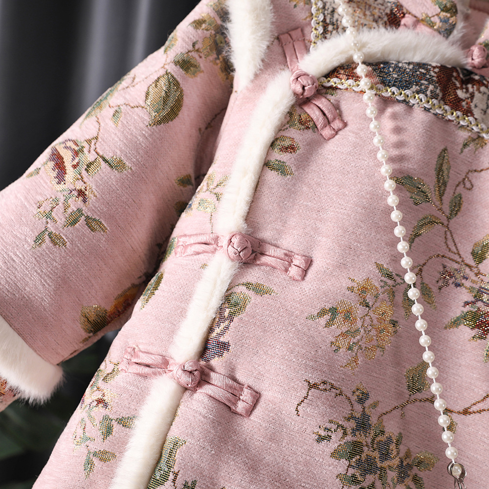 漢服の女の子は新年を祝って子供の中国風の唐服の子供の冬の金の1歳の旗のガウンのスカートを着ます。