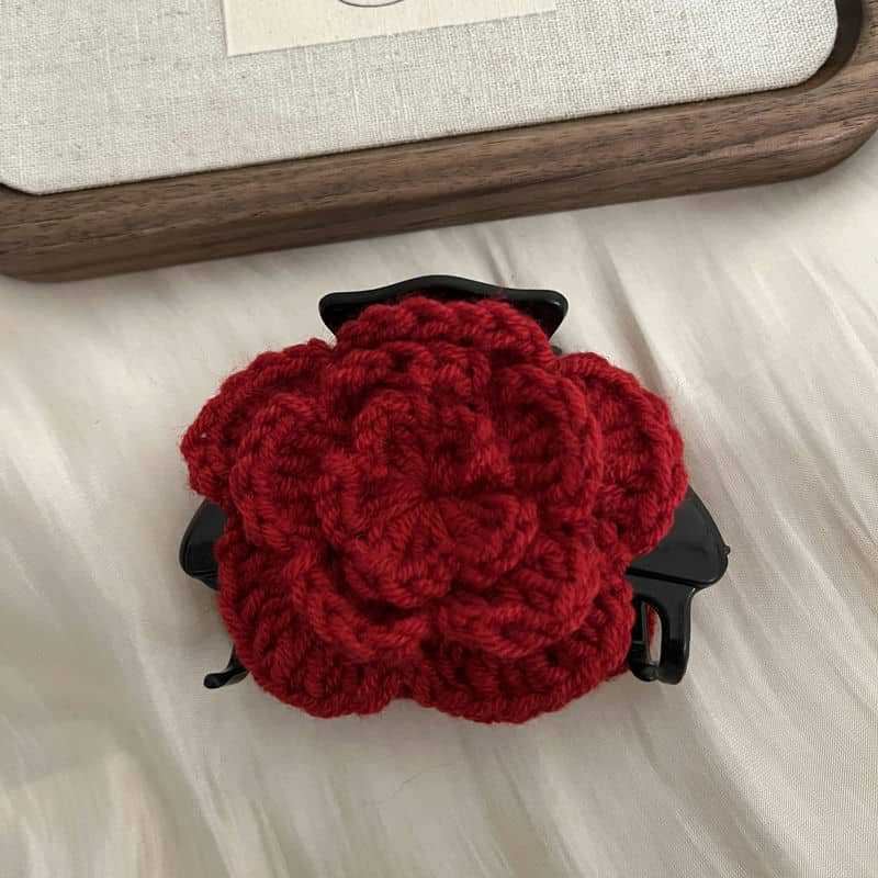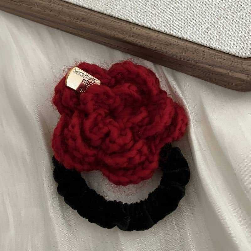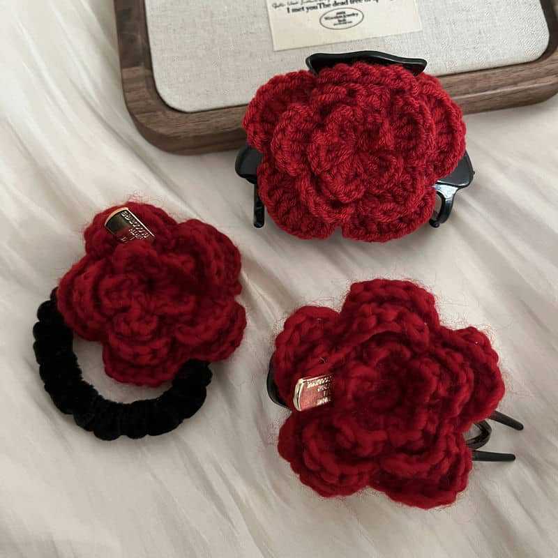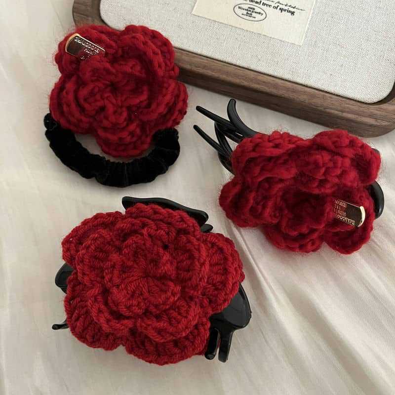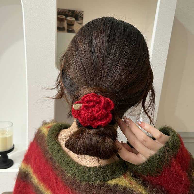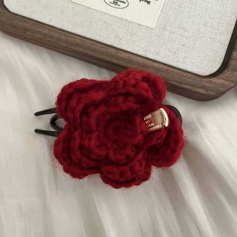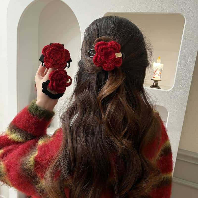 小さな赤い花をプレゼントします。秋冬の赤い毛糸のバラの花のヘアピンの女性の後頭部は髪の輪をつかんで横に挟みます。