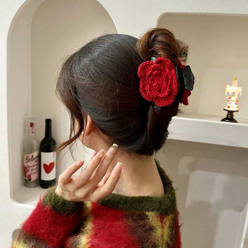 赤いバラのニットヘアゴム,レッドローズニット両面グリッパースタイル,レッドローズニットの横クリップスタイル