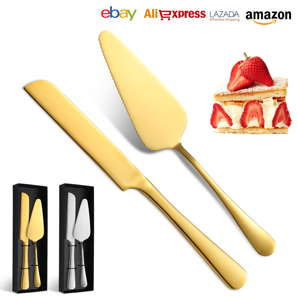 ステンレスのケーキのシャベルの2つのセットの結婚式のパーティーはピザのシャベルのチーズのパンのナイフのアマゾンを焼きます。