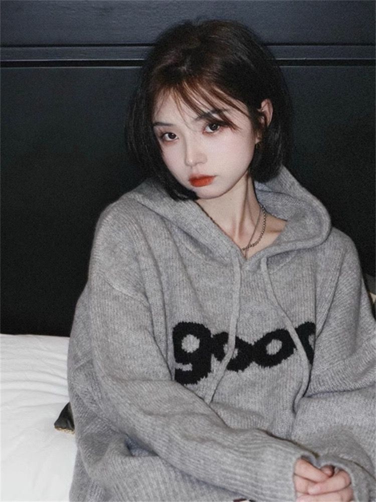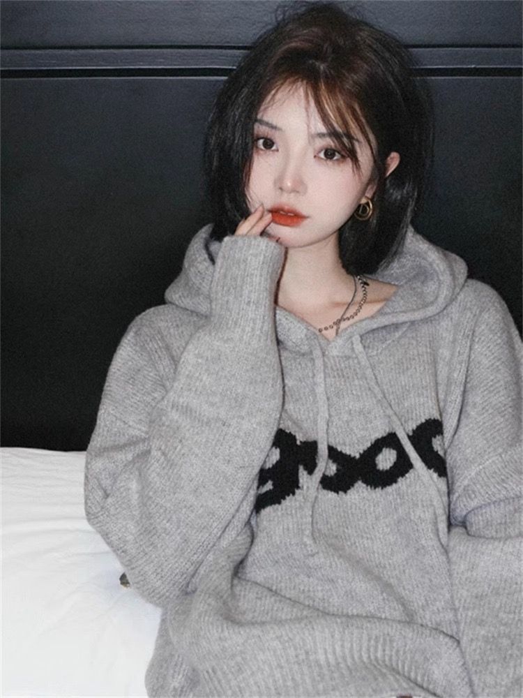 グレーのフード付きニットセーター、男女兼用、オーバーサイズ、高級感、文字ジャカード、原宿風