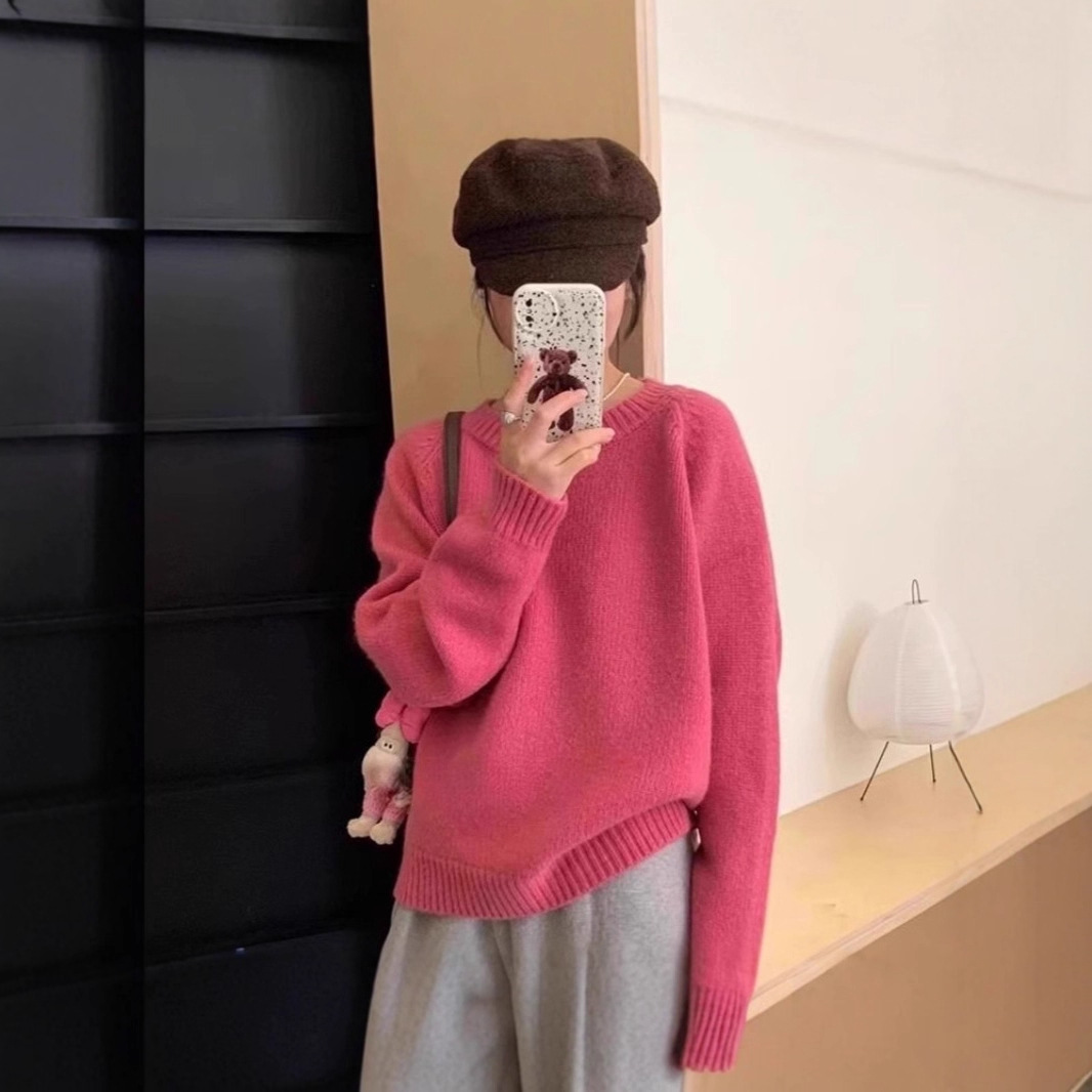 韩版简约糖果色套头毛衣女秋冬厚实圆领别致宽松软糯针织衫上衣