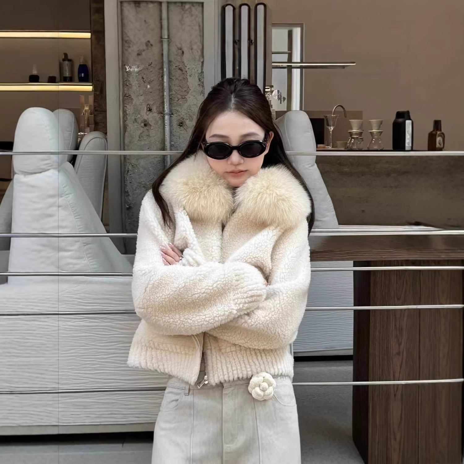 气质毛领羊羔毛外套女秋冬新款白色摇粒绒皮毛一体毛上衣