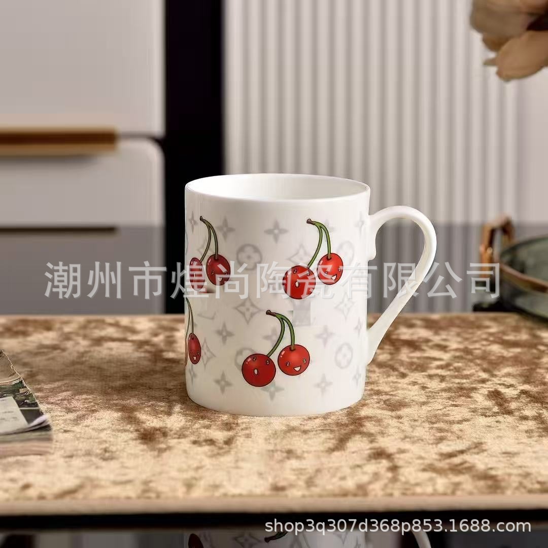 欧式轻奢驴家樱桃骨瓷马克杯大容量水杯子高颜值把手马克杯礼盒装