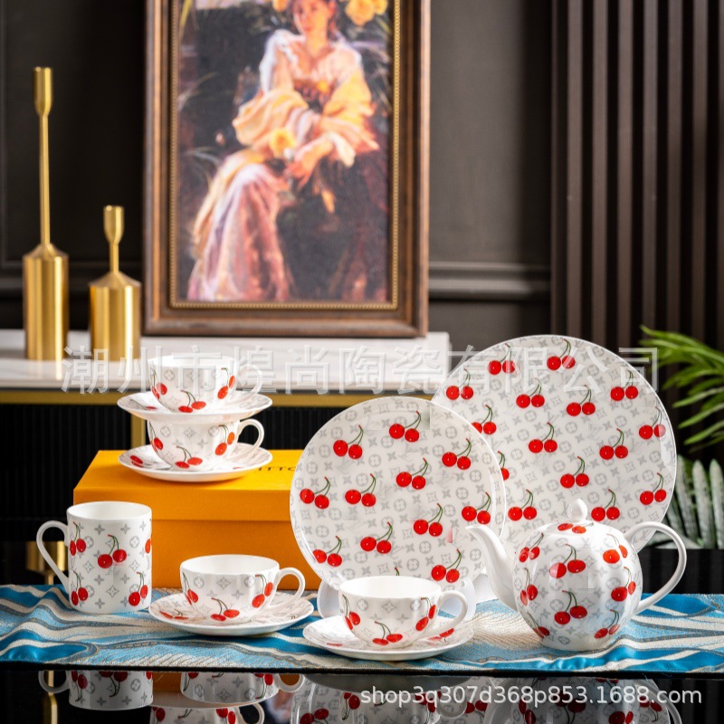 欧式轻奢驴家樱桃骨瓷咖啡杯碟套装下午茶咖啡杯碟高颜值水杯礼盒