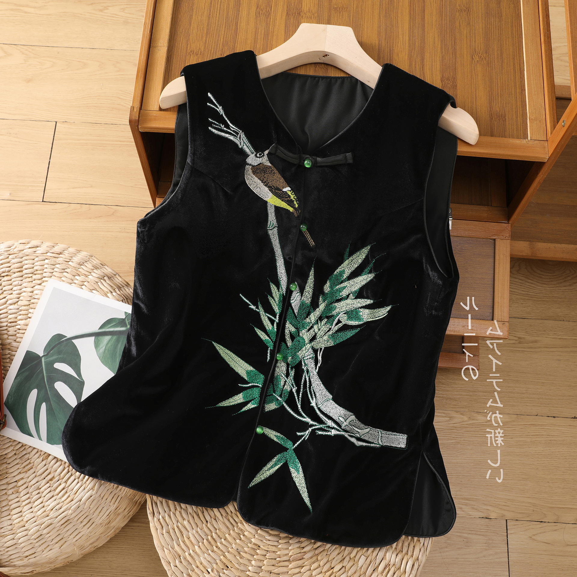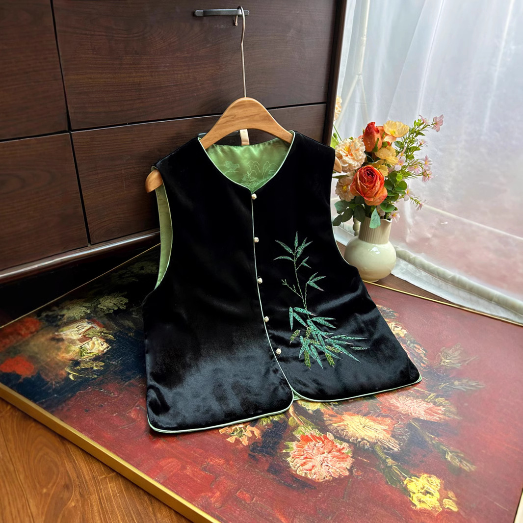 中国風新中式シルクベルベット刺繍両面着用ベスト・マント・カミソール2025高級ビーズ刺繍ベスト・レトロ風
