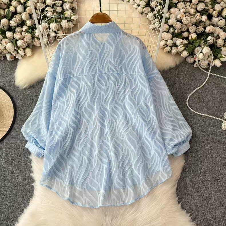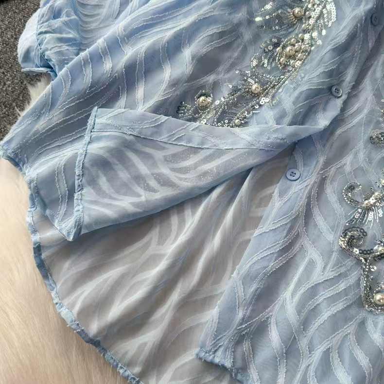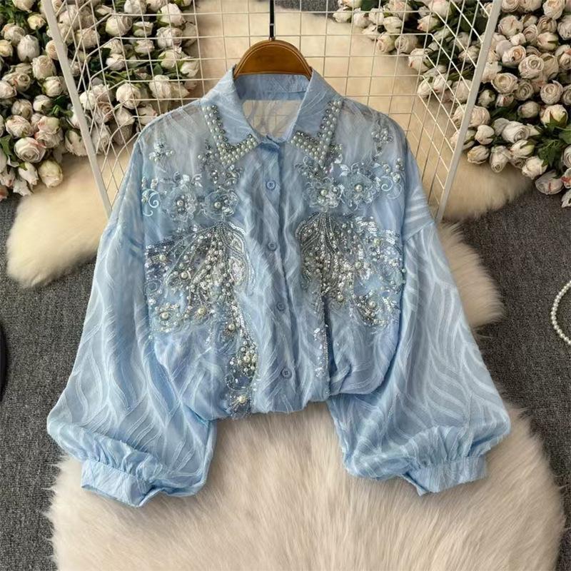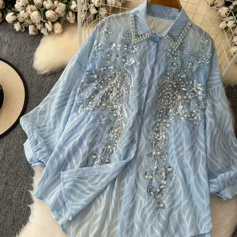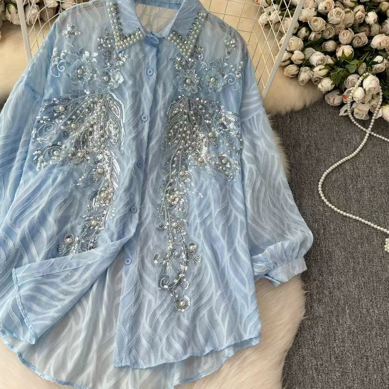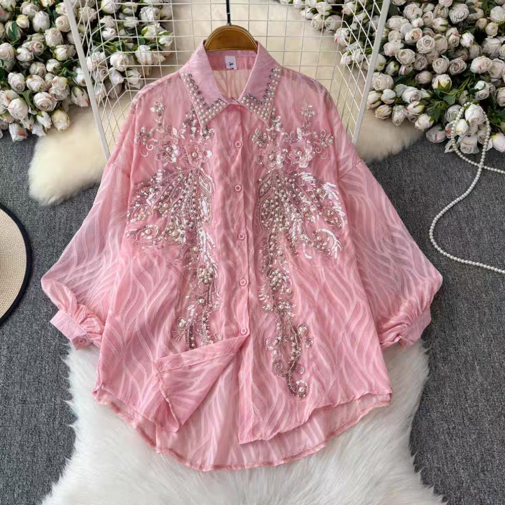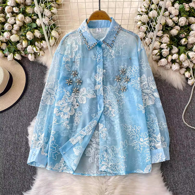 轻奢重工刺绣镶钻翻领长袖防晒衬衫女春夏季薄纱衬衣宽松显瘦上衣