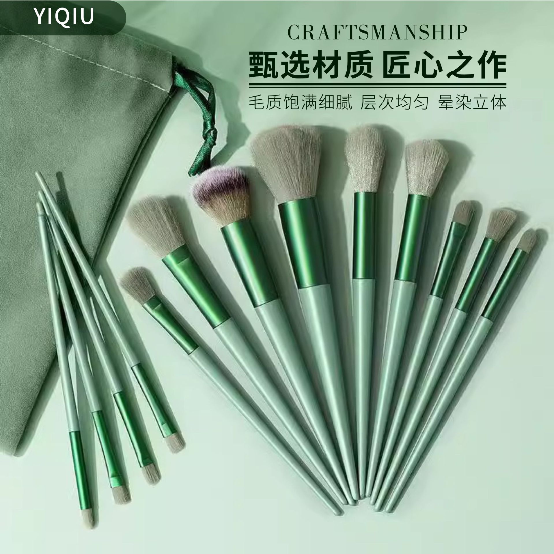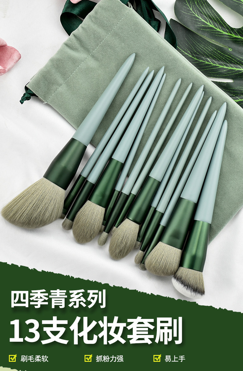 初心者向けメイクブラシ13本セット、ルースパウダー、アイシャドウ、リップコンシーラー、チーク、ファンデーション、柔らか毛の美容ブラシ、四季緑ブラシ