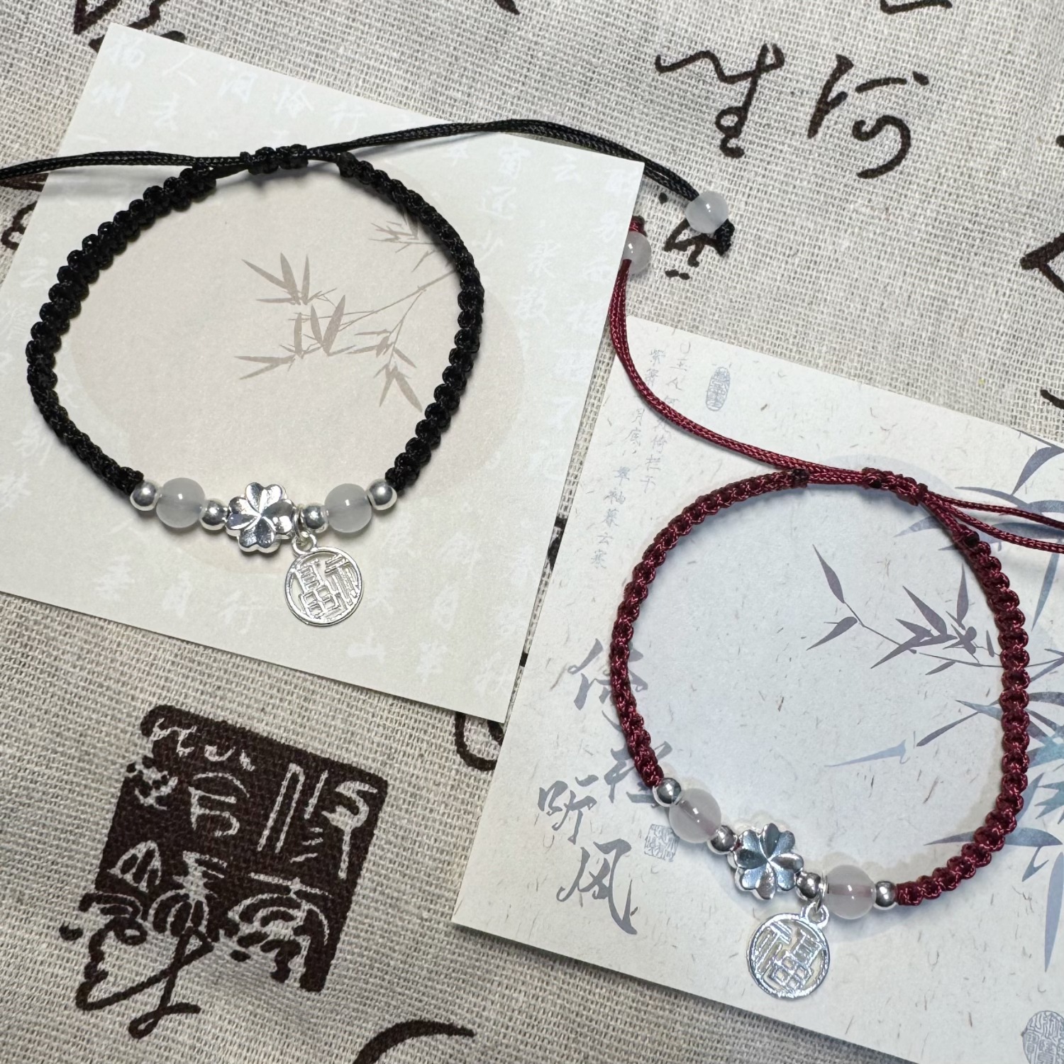 中式四叶草福牌手链平安古风设计红绳手工编织手绳送情侣闺蜜手饰