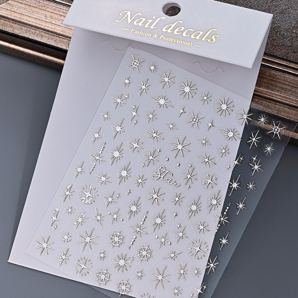 TEMU新款银色星月美甲贴纸12款欧美跨境星星月亮指甲装饰背胶贴纸