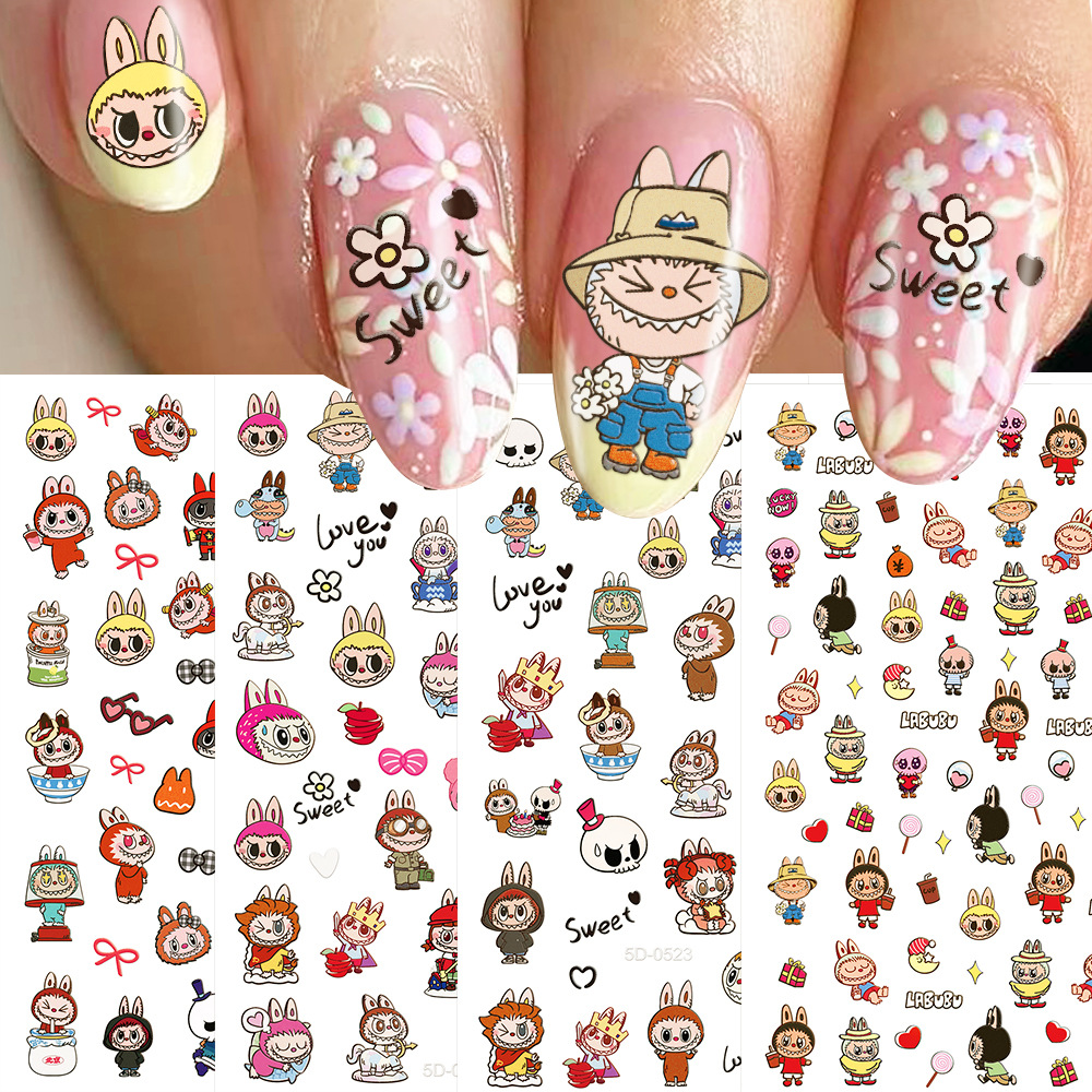 漫画かわいい LABUBU エンボスネイルアートステッカー北欧エルフスタイルラブブ 5D 立体ネイルデコレーションステッカー