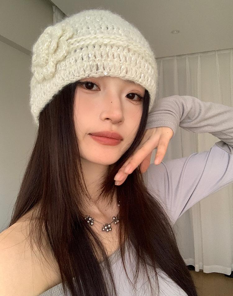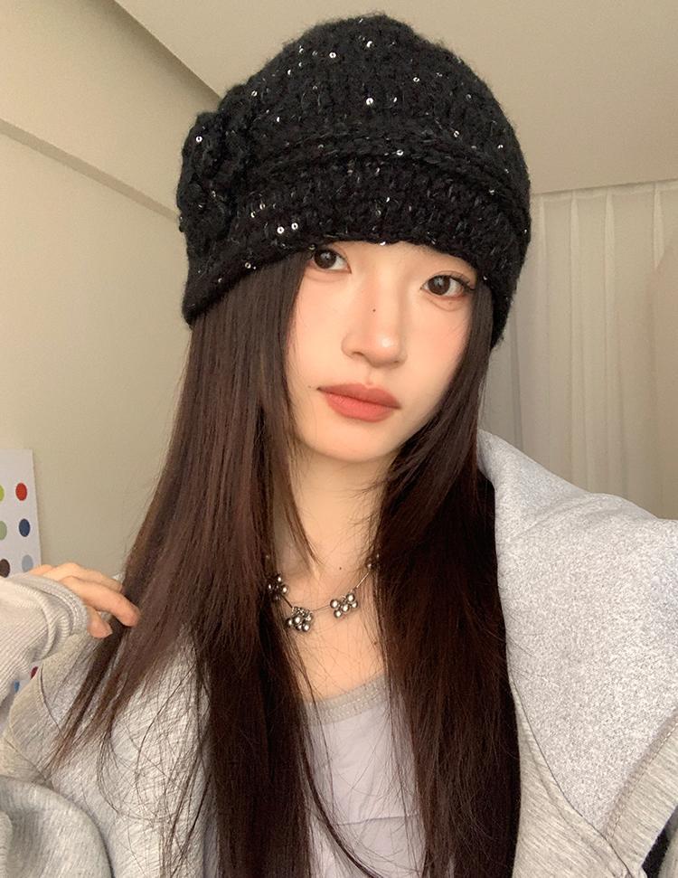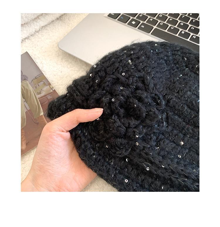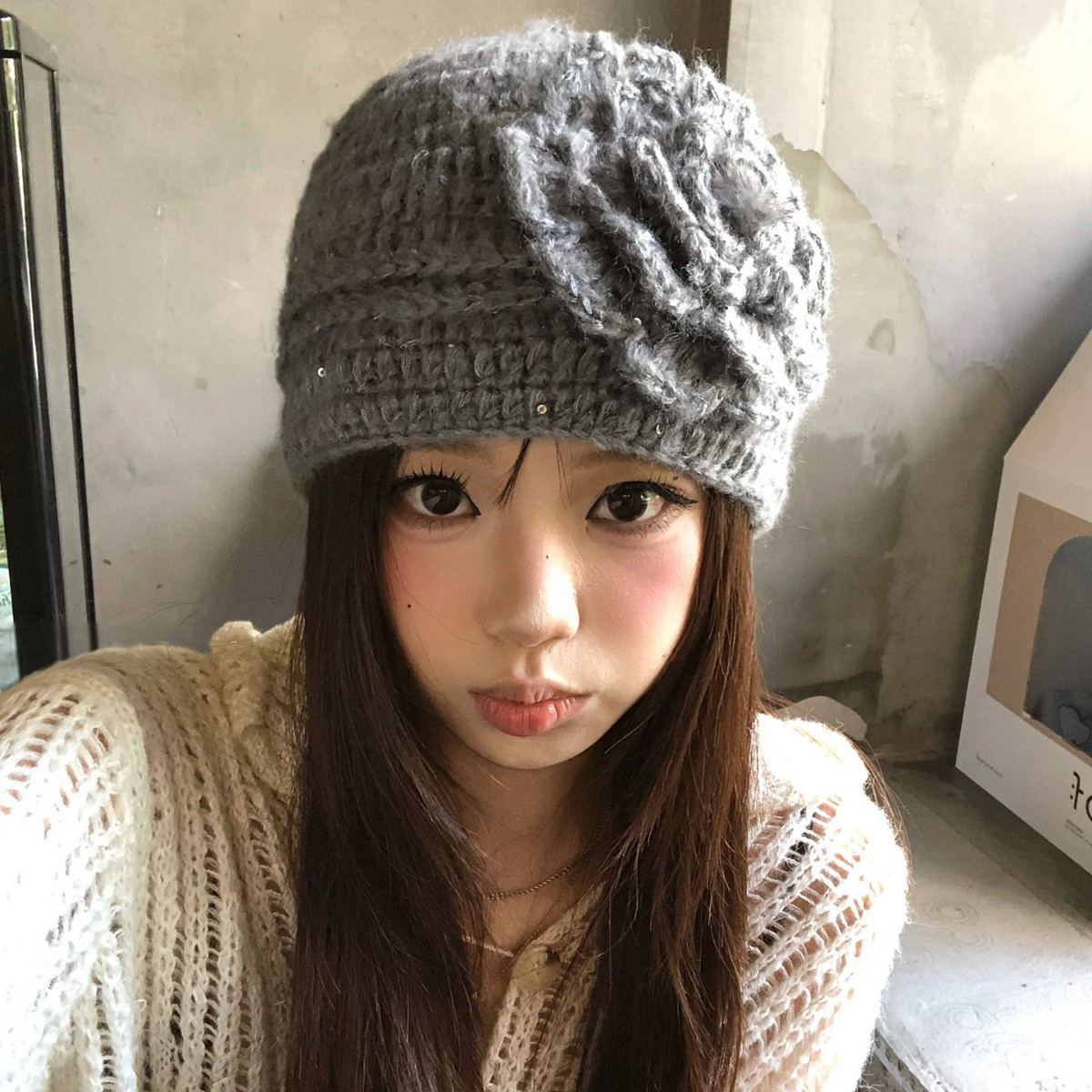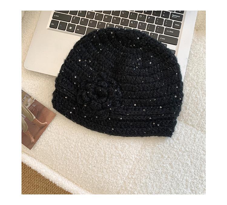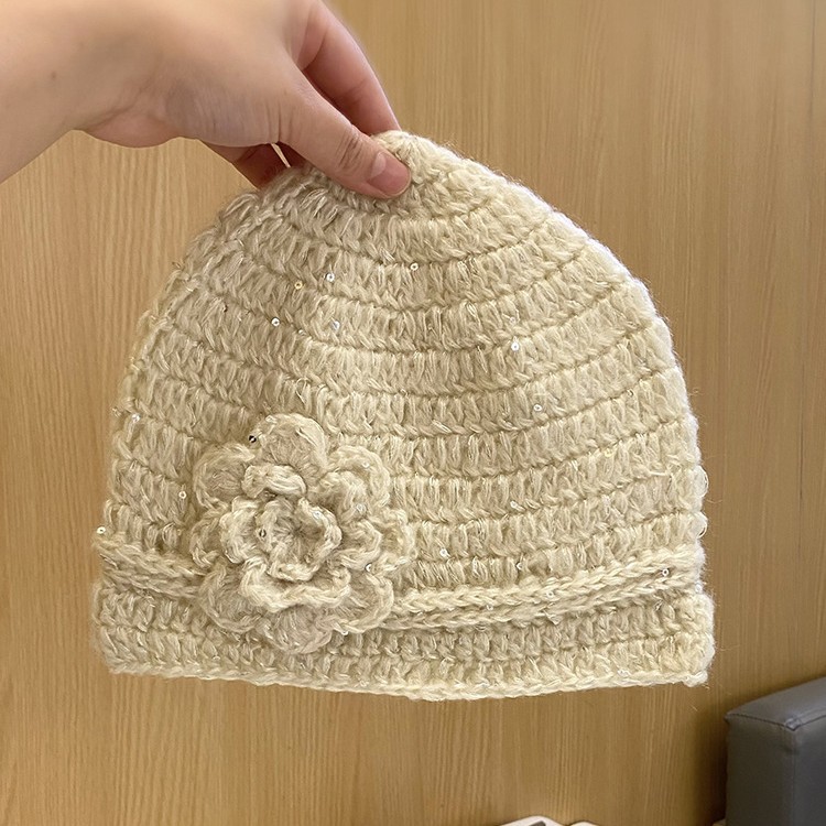 秋冬文艺百搭毛线帽亮片钩花帽子女复古氛围感花朵针织套头帽