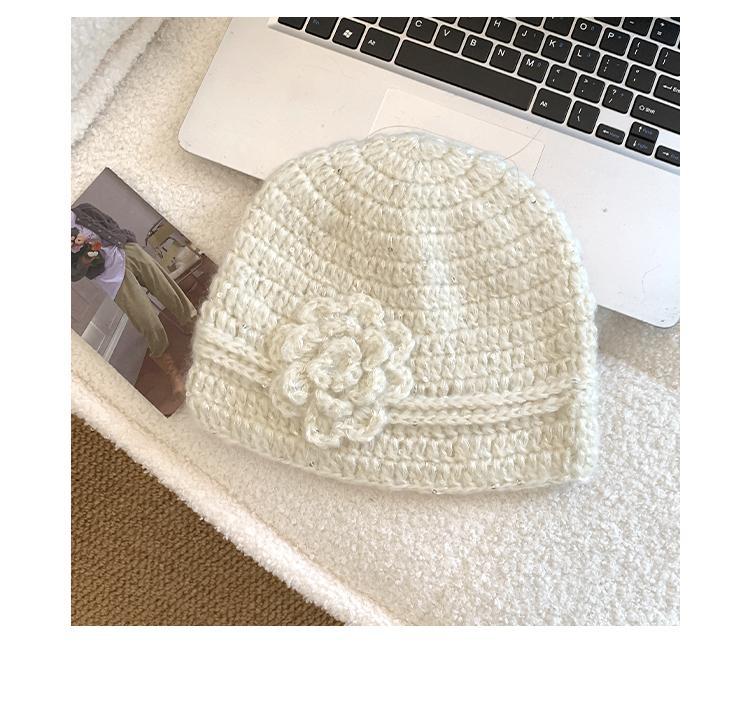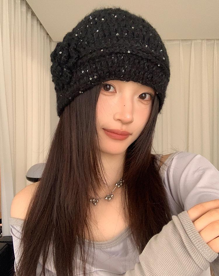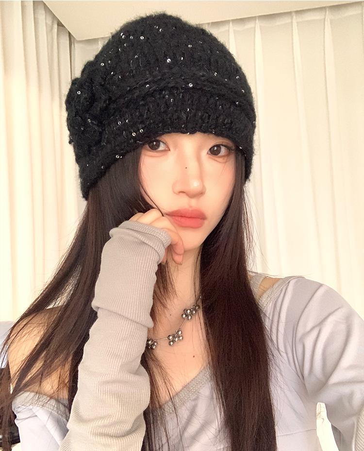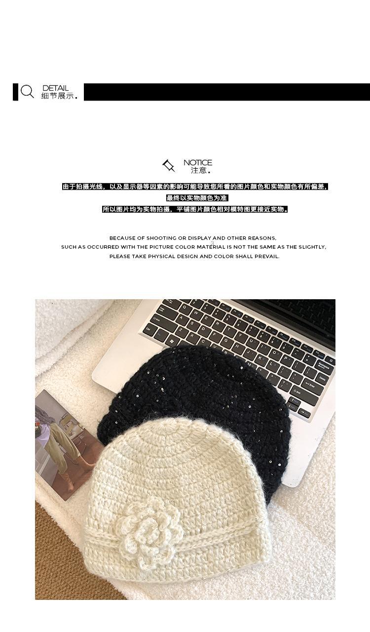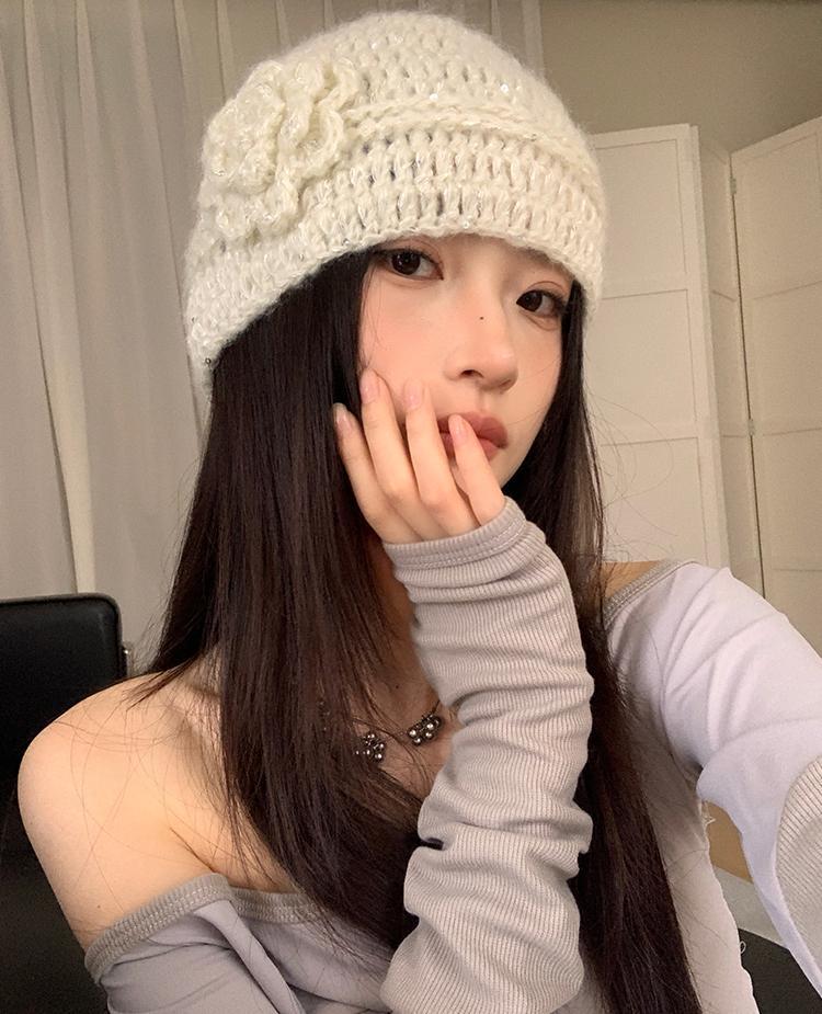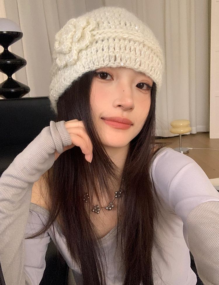 秋冬文艺百搭毛线帽亮片钩花帽子女复古氛围感花朵针织套头帽