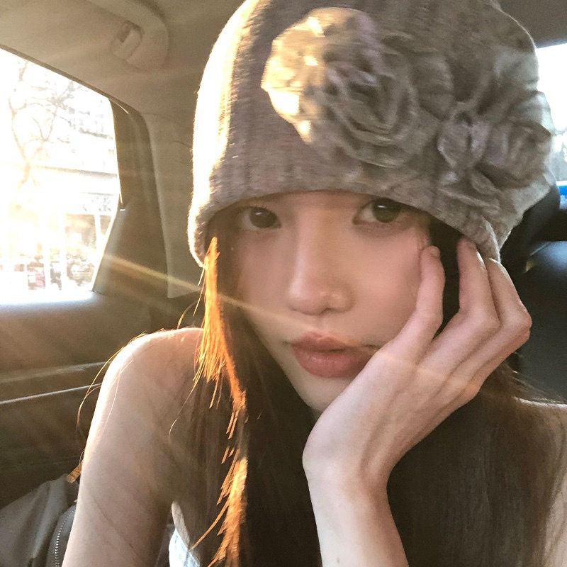 レトロなフランスの雰囲気感が細くて、花のニットの頭の帽子が可愛いです。