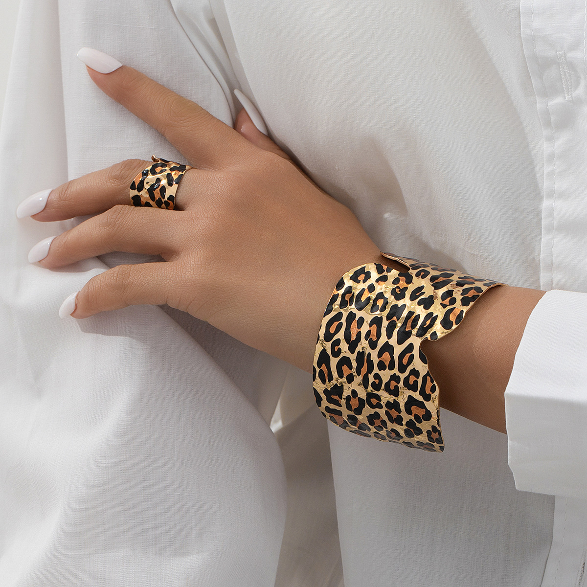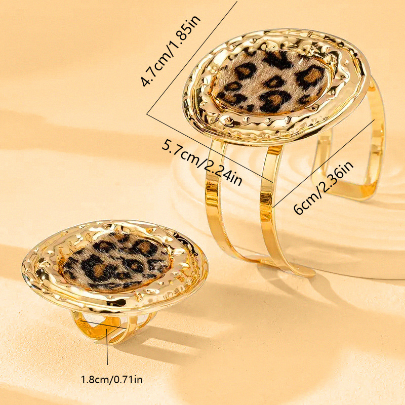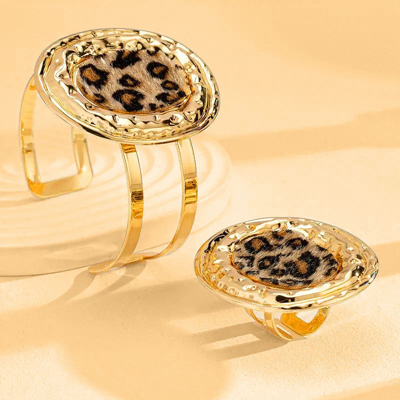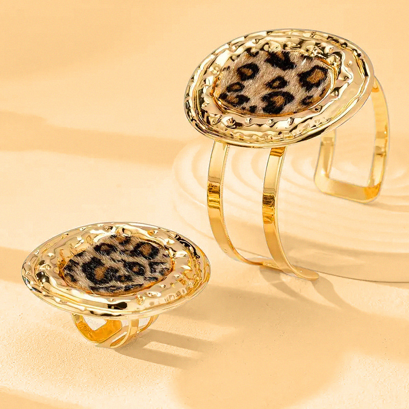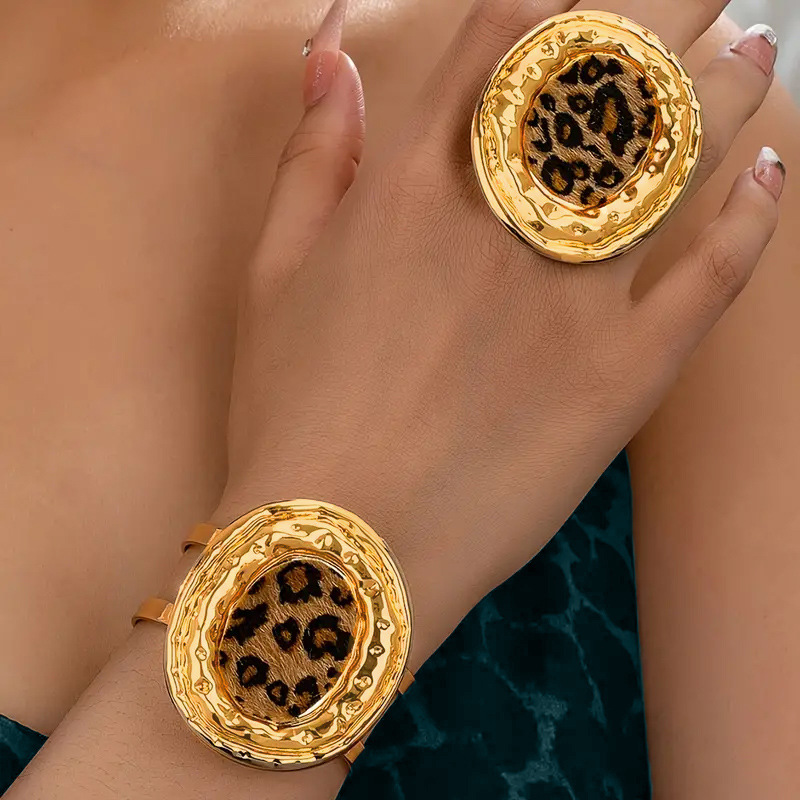 欧米の大げさな越境ファッション金属豹紋の広い面の不規則な開口部の女性のブレスレットの指輪のアクセサリーのセット
