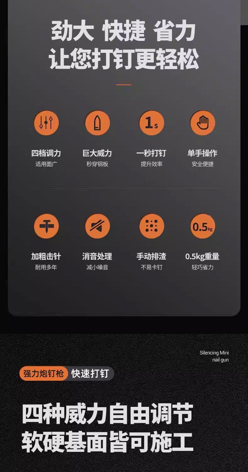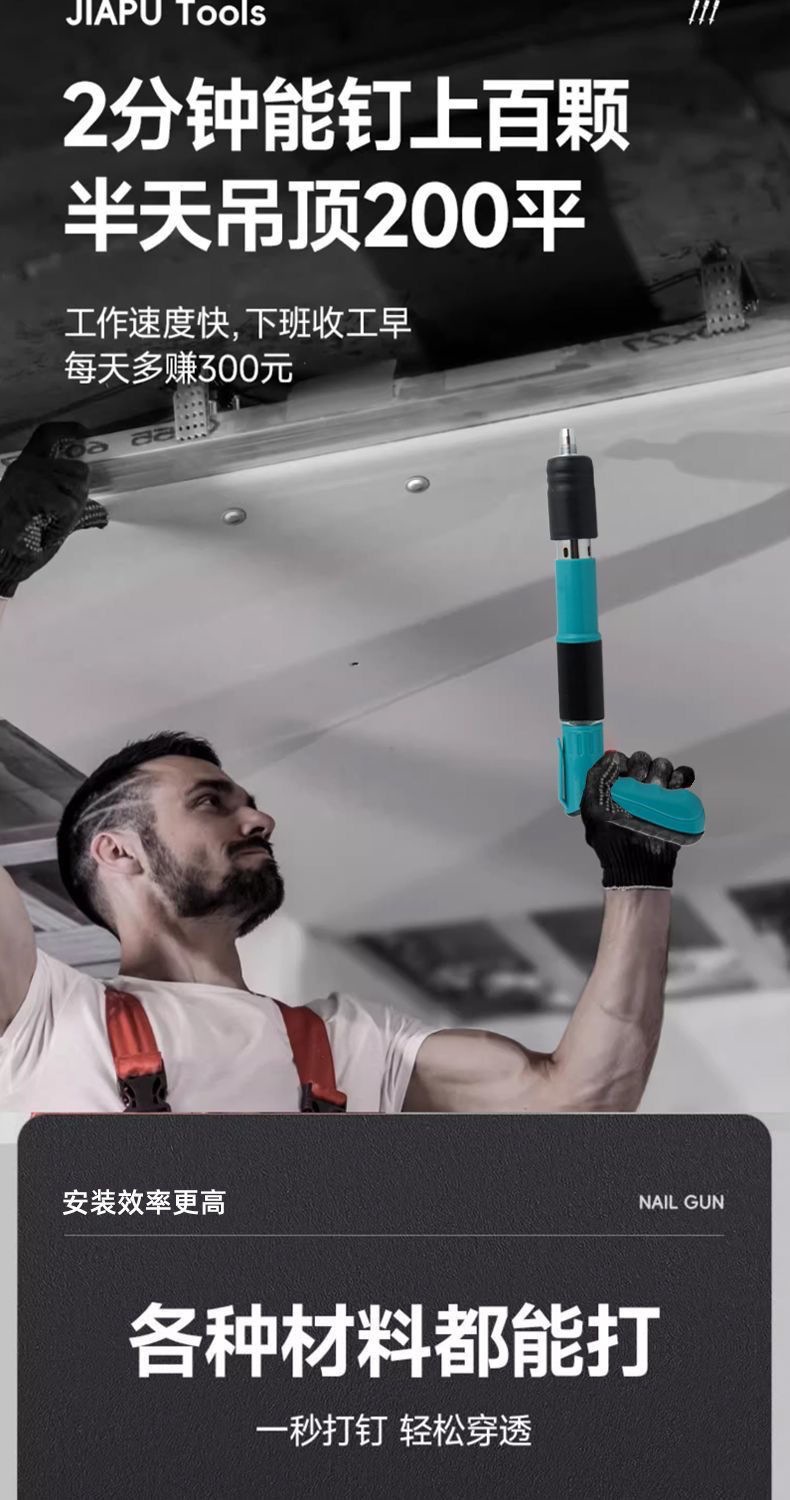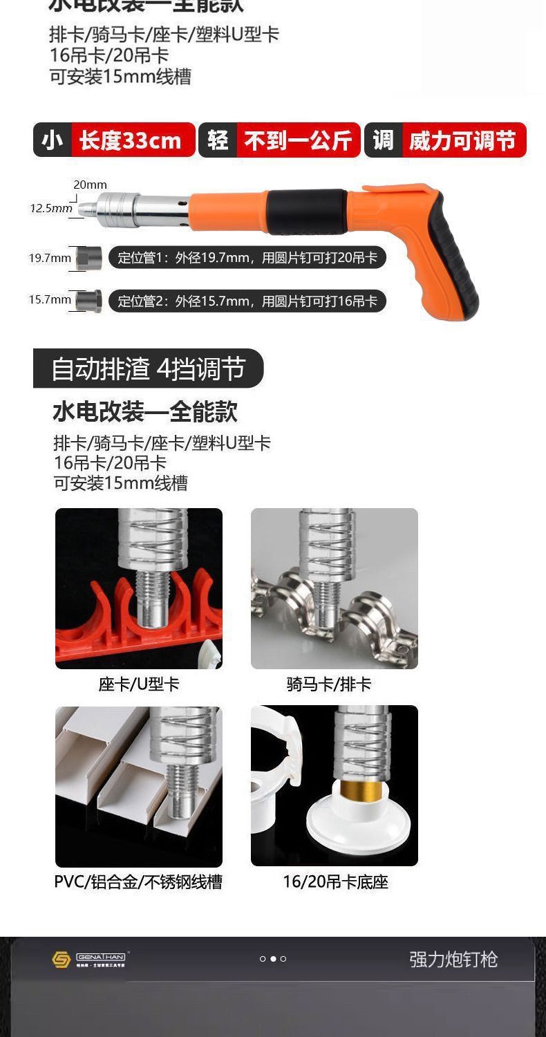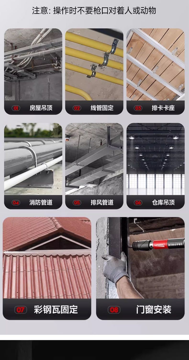 卸売用釘打ち機、天井施工用、特殊鋼製、コンクリート一体型消音、セメント壁用鋼製釘
