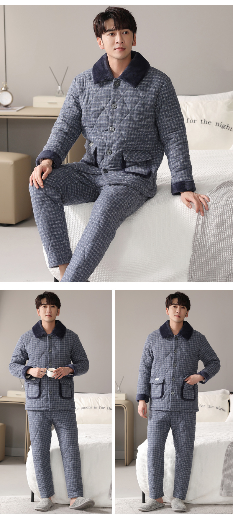 男性のパジャマを卸売りします。秋冬は綿のカーディガンを挟んで保温します。