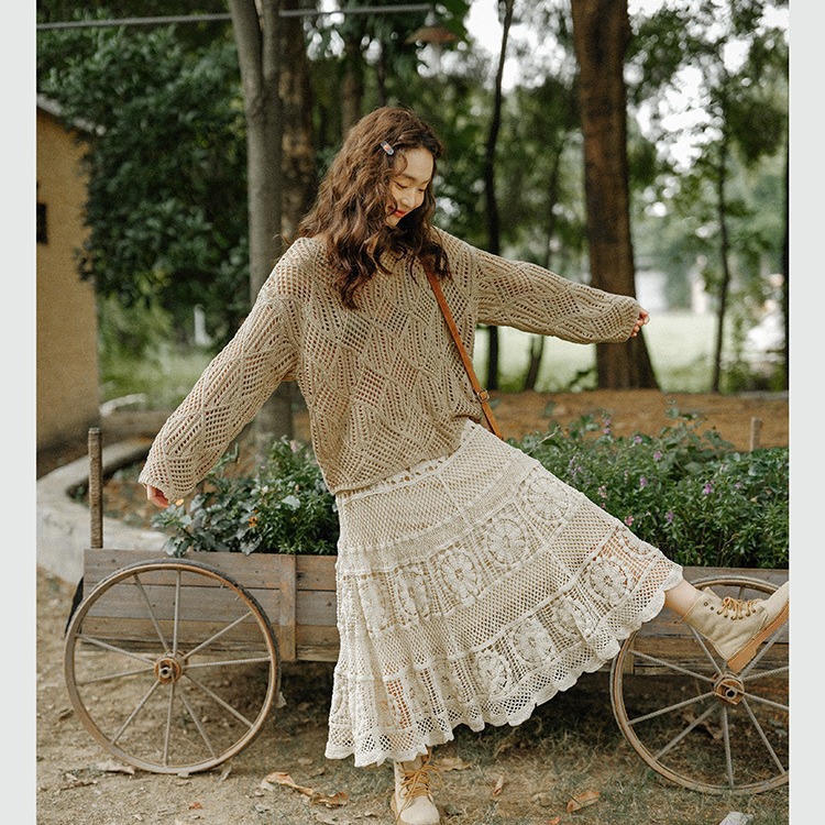 ビーチリゾート風宮廷鉤花透かしレーススカート気質韓範レトロ中長包尻a字スカート