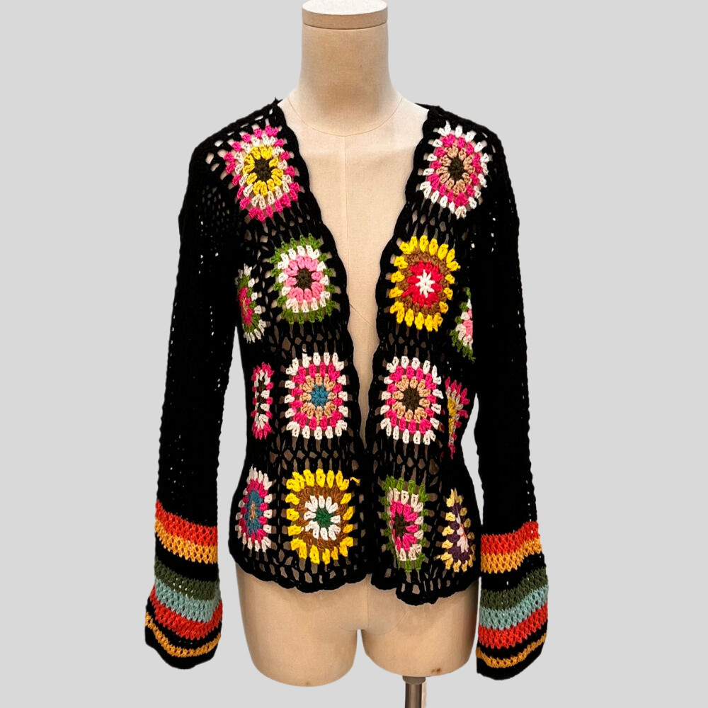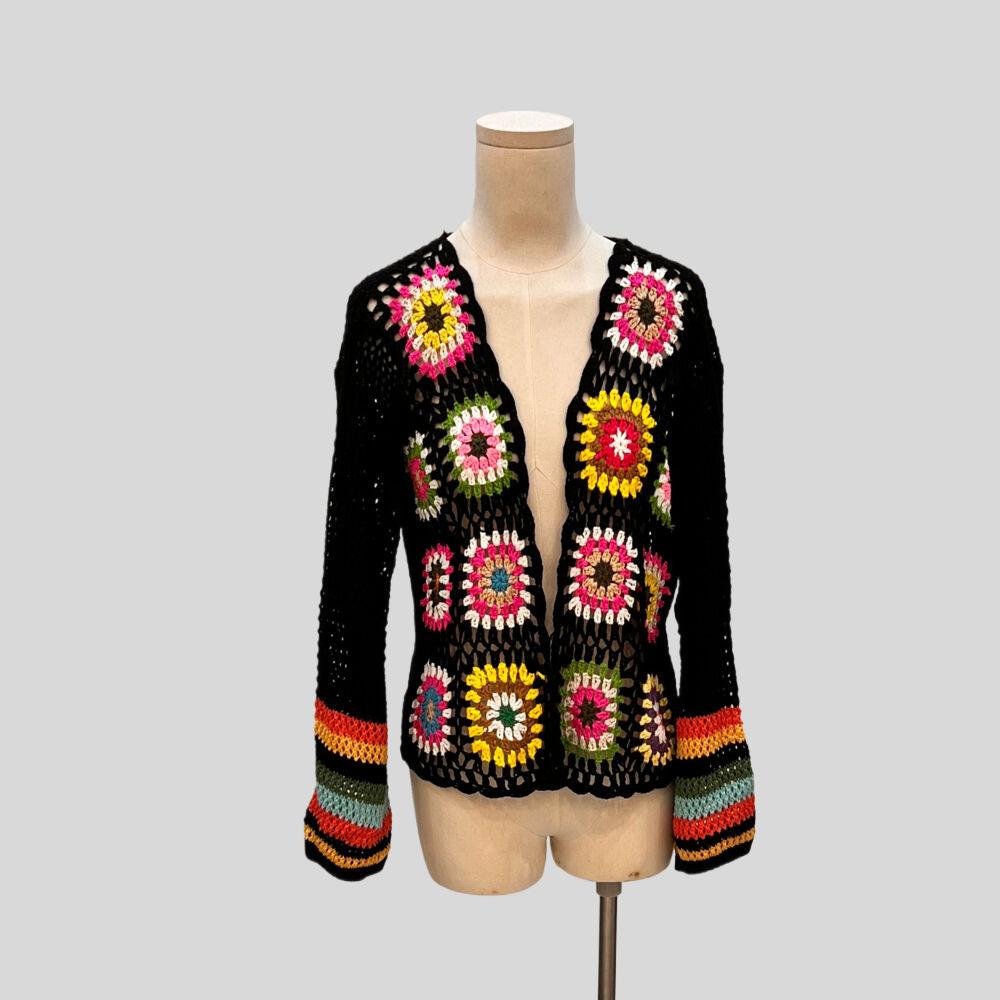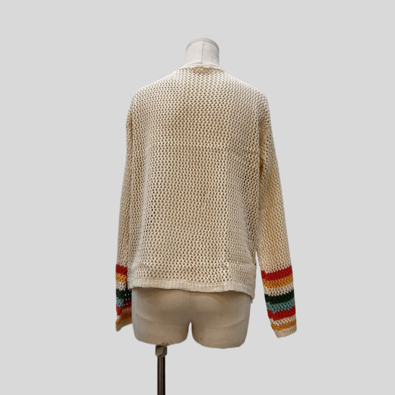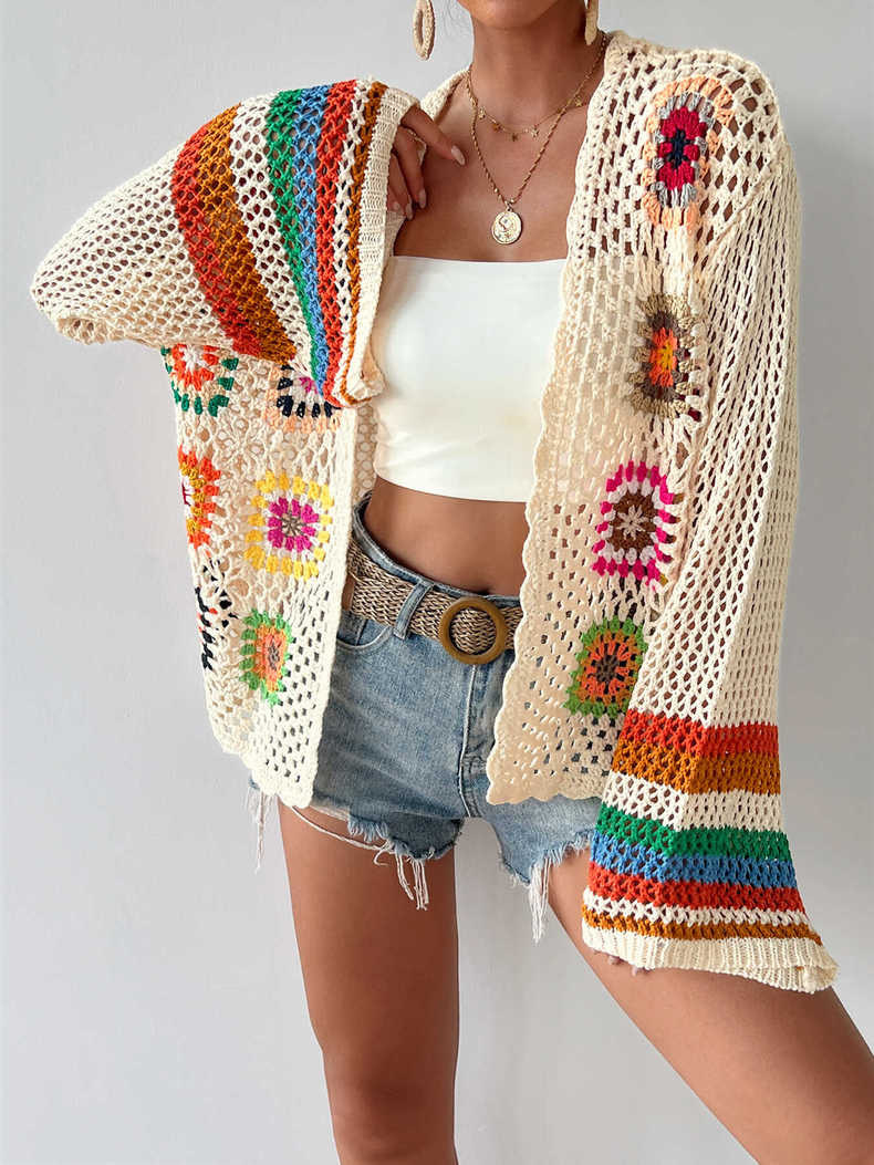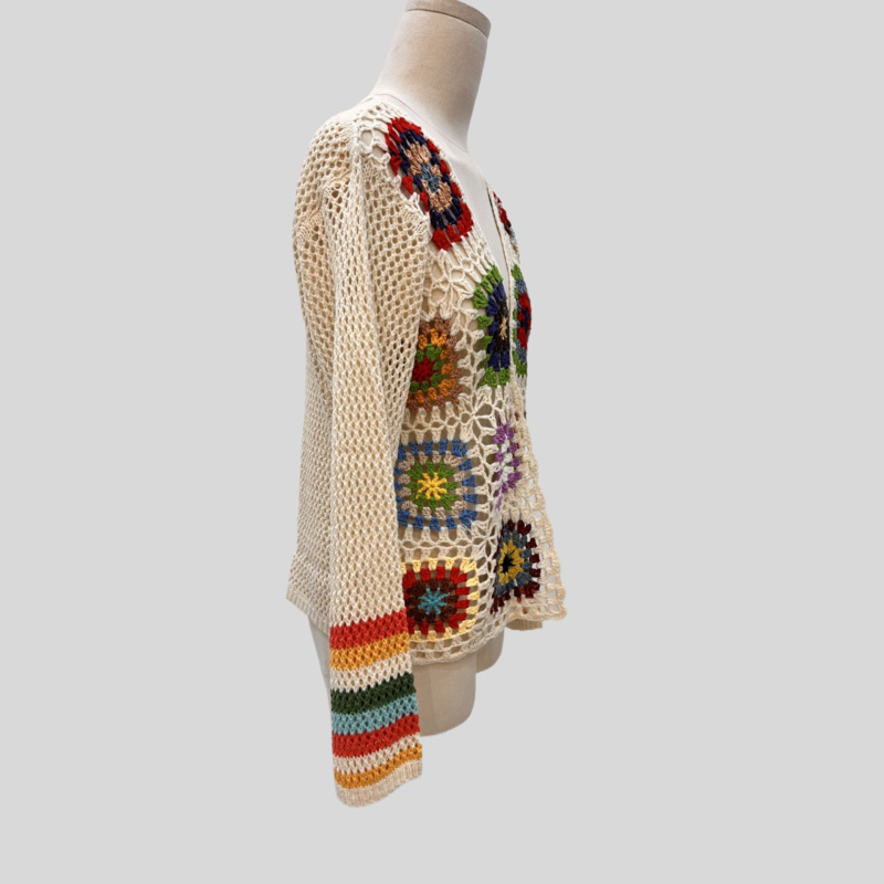 民族風レトロ鉤花虹長袖カーディガンランダム色ブロック手作り鉤花セーター透かし編み上着