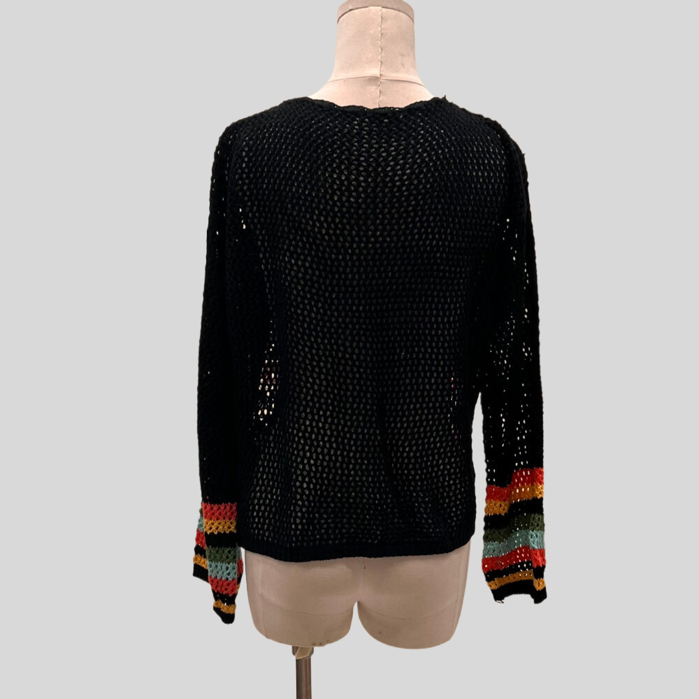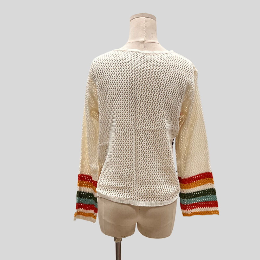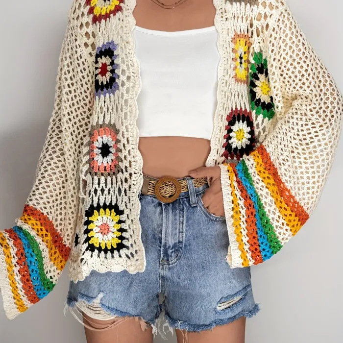 民族风复古钩花彩虹长袖开衫跨境亚马逊新品手工钩花毛衣镂空上衣
