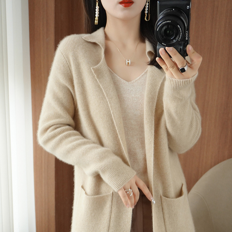 大码中长款翻领开衫女2025秋冬宽松薄款针织衫毛衣外套外搭上衣潮