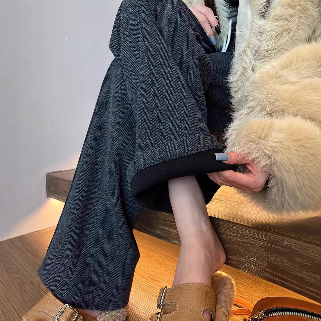 グレーのベルベットの毛は狭いバージョンのワイドパンツの高腰垂れ下がった感じのカジュアルな人の字の紋様の厚いストレートスーツのズボンの女性の秋冬