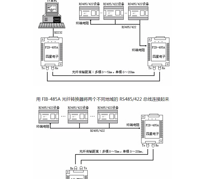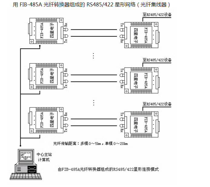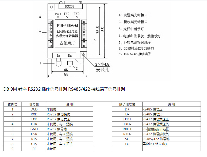 FIB-485A-M 是四星电子生产的一款工业级 RS485/422/232 到光纤的转换器,实现一路 RS485 或 RS422 或 RS232 ( TXD 、 RXD 、 GND )信号在光纤上的透明传输,无需改动原有的通信协议和软件,即插即用直接替代铜线导体传输。
