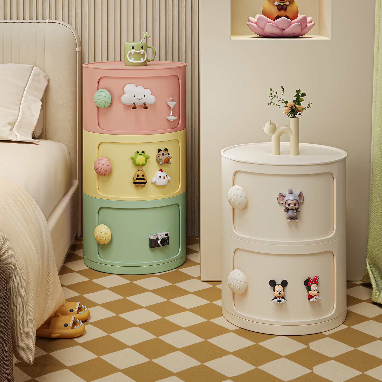 奶油风床头储物柜小户型ins风儿童玩具收纳柜多巴胺圆桶置物柜子